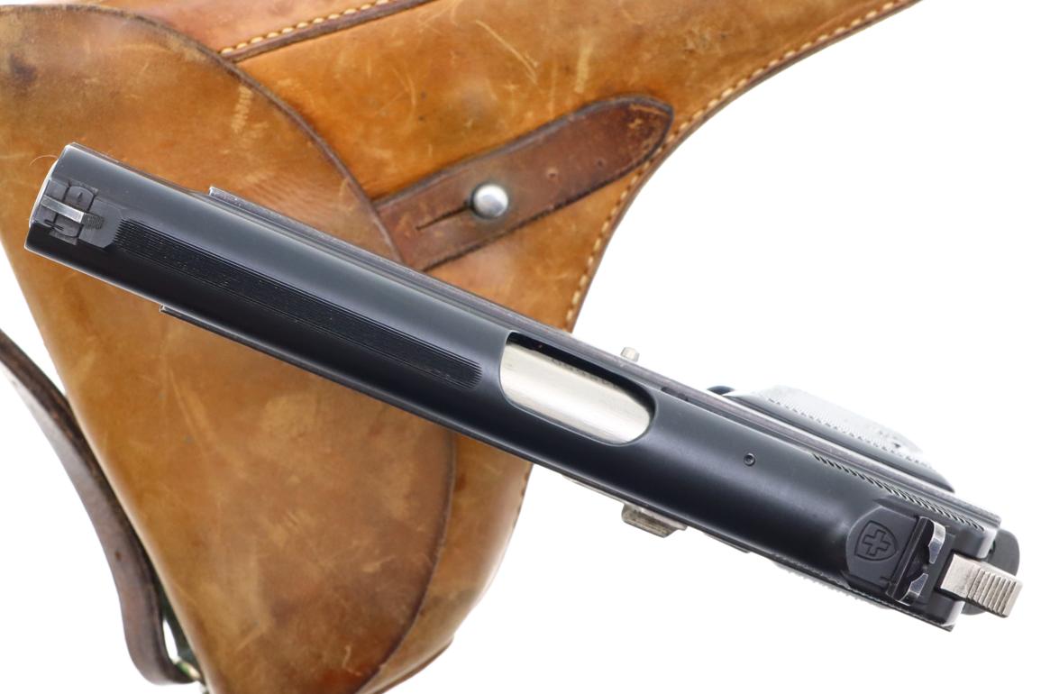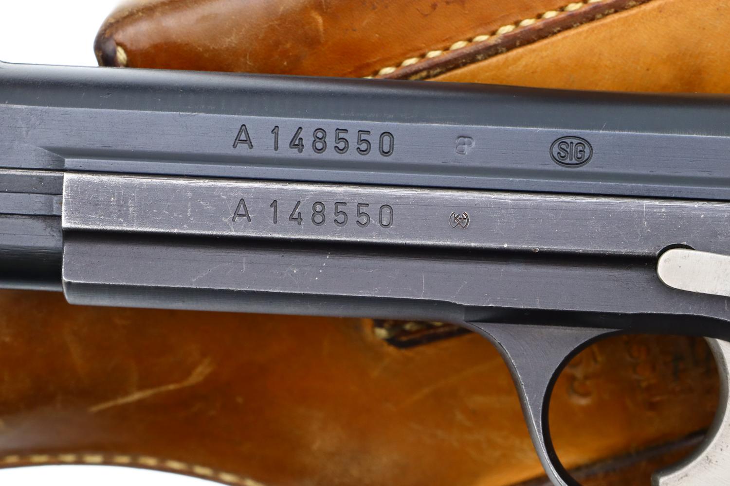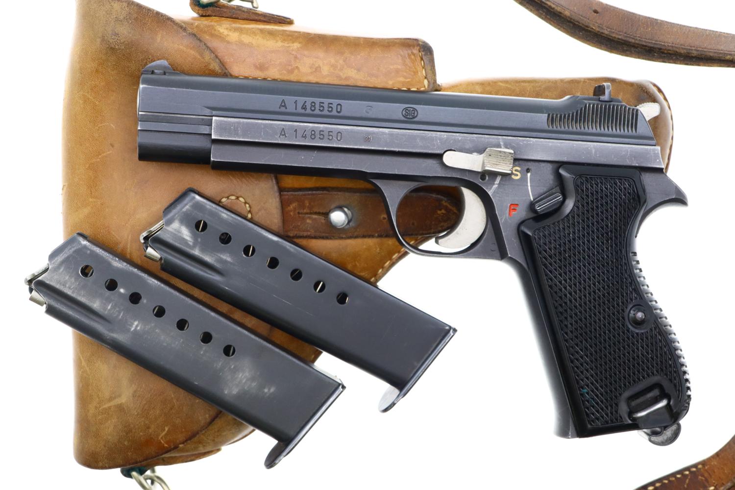 Attractive, all-matching, SIG P49, in 9mmP, with matte finish, 4.75” barrel, drift adjustable front and rear sight, and serrated slide release. The left side of the slide and frame are proofed and marked with the full serial number that is repeated on the right side of the barrel hood. Safety detentes are marked with an “S” in white and “F” in red. “P” release marked on the front of the trigger guard and discretely applied import marking on base of frame. Disassembly shows a matching hammer assembly with the usual half cock. Fitted with checkered black plastic grips, integral escutcheons, secured with a single transfer screw. Two matte finish magazines. Leather military holster, dated ‘1955’ and leather strap dated ’56.’