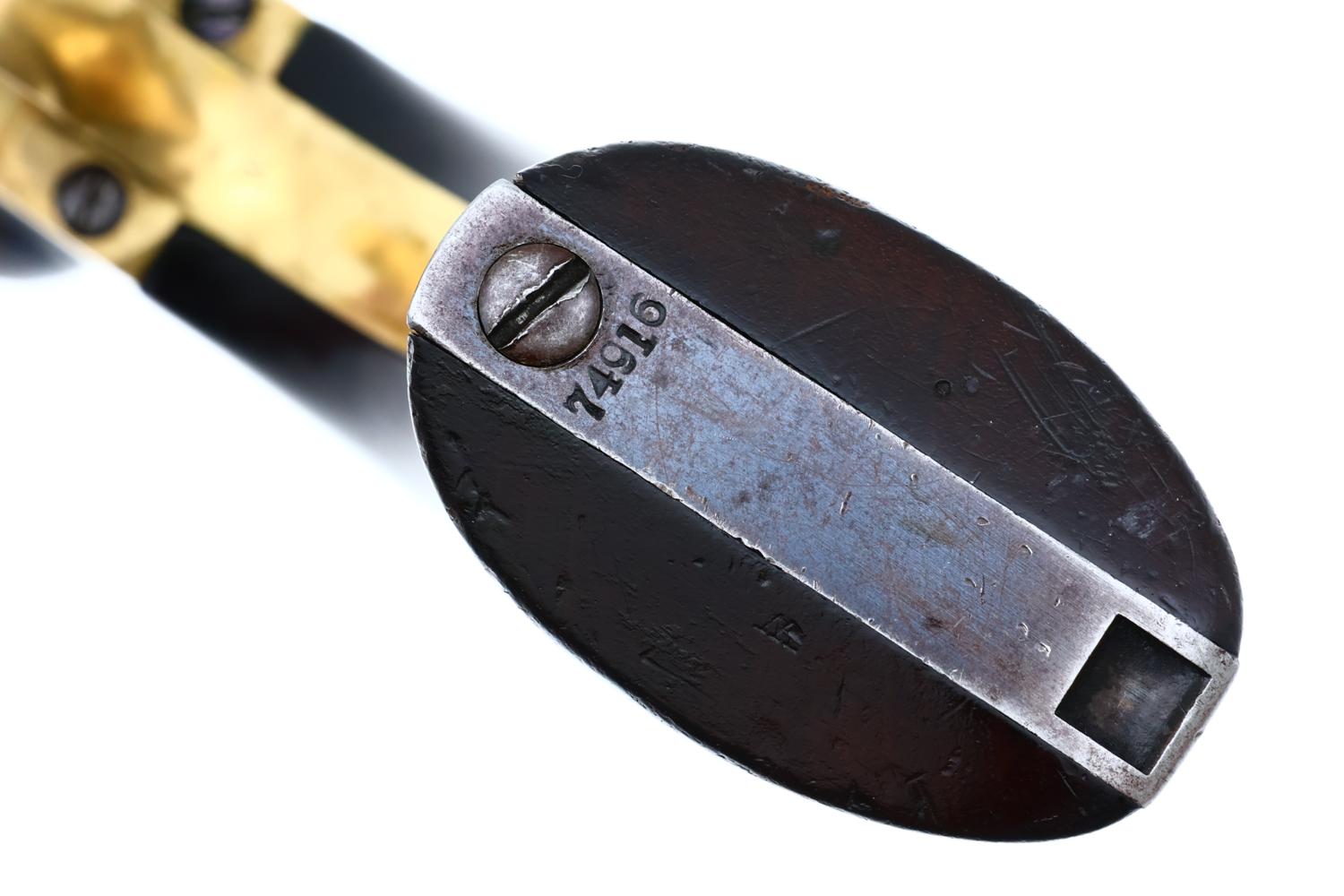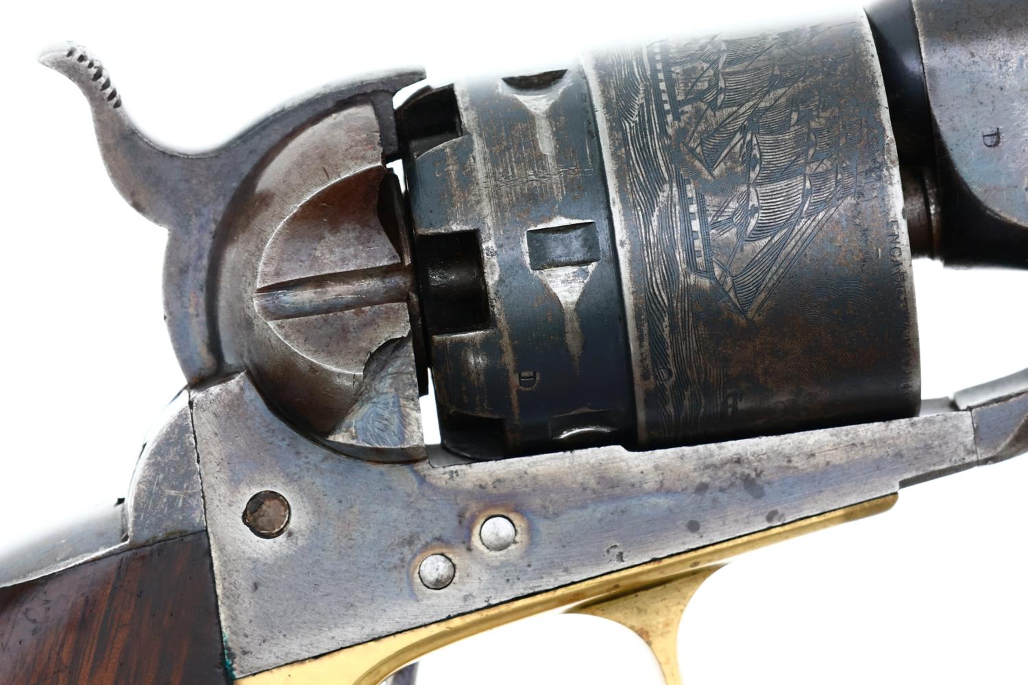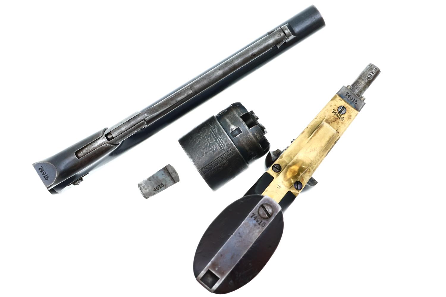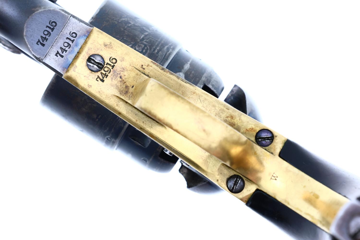 VG+ original condition with fading in usual areas of holster contact and handling. Faded/dulled color case hardening on ramrod, hammer and frame. Brass trigger guard having toned to a pleasant mustard color. Grips oil stained with scattered handling marks, inspection cartouches easily discernible. Bright bore with light oxidation, sharp rifling. Correct manual mechanics with each of the cylinders indexing nicely on full cock. EXC original discharge document with expected fading and folds.