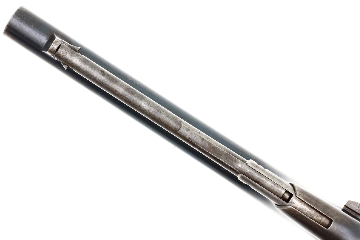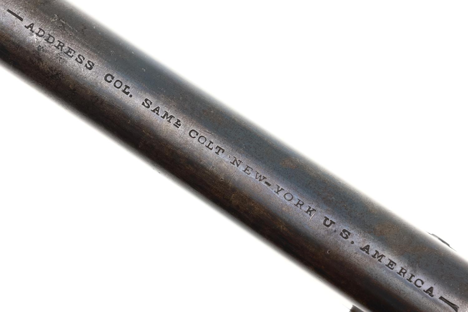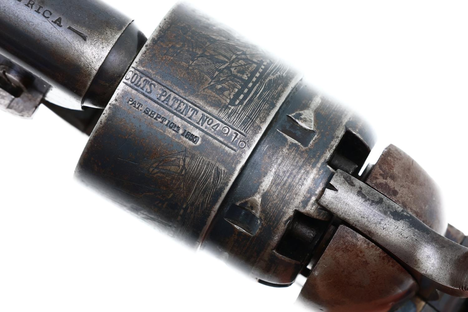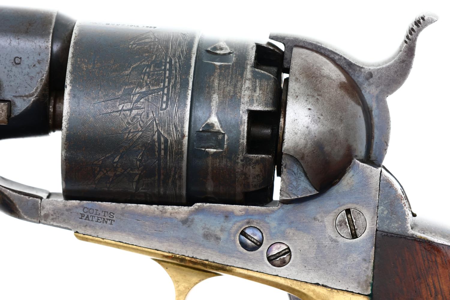VG+ original condition with fading in usual areas of holster contact and handling. Faded/dulled color case hardening on ramrod, hammer and frame. Brass trigger guard having toned to a pleasant mustard color. Grips oil stained with scattered handling marks, inspection cartouches easily discernible. Bright bore with light oxidation, sharp rifling. Correct manual mechanics with each of the cylinders indexing nicely on full cock. EXC original discharge document with expected fading and folds.