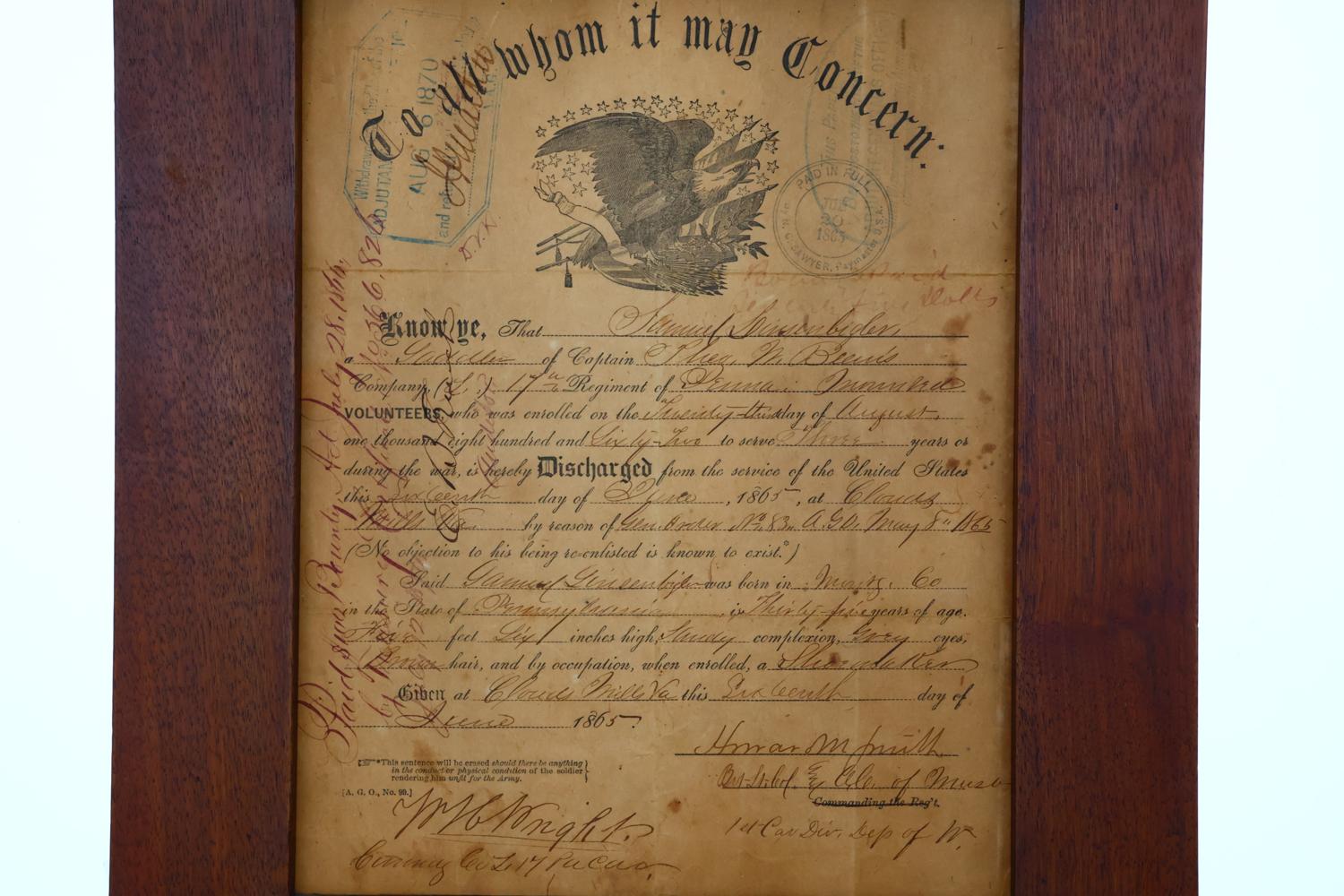 All matching standard configuration Colt 1860 Army revolver, .44 percussion, SN: 74916, manufactured in 1862 with over 129,000 having been purchased by the US Government. Features include a round 7.5″ barrel with fixed blade front sight and hammer-notch rear sight, engraved rebated cylinder depicting naval battle scenes of the Battle of Campeche on May 16, 1843, and brass trigger guard. Top of barrel marked “ADDRESS COL. SAML COLT NEW-YORK U.S. AMERICA” with matching cylinder showing “COLTS PATENT No 4916” and “PAT SEPT 10TH 1850” patent markings. Left side of frame marked “COLTS PATENT” below the cylinder. Fitted with smooth walnut grips showing natural wood grain and cartouche acceptance on each panel. Grip strap is inspection-stamped “W”. Serial number 74916 appears on brass trigger guard, under barrel, steel frame, and butt. Wedge and cylinder axle marked “4916”. Accompanying this revolver is a framed, original discharge paper of Samuel Linsenbigler, dated 16 June 1865, referencing his three years of duty during the Civil War. On the back are additional notes dated 6 August 1870. The Colt 1860 Army became one of the most successful revolvers in firearms history and was widely used during the American Civil War and western expansion, favored by military forces and civilians including Wild Bill Hickok and Buffalo Bill Cody!