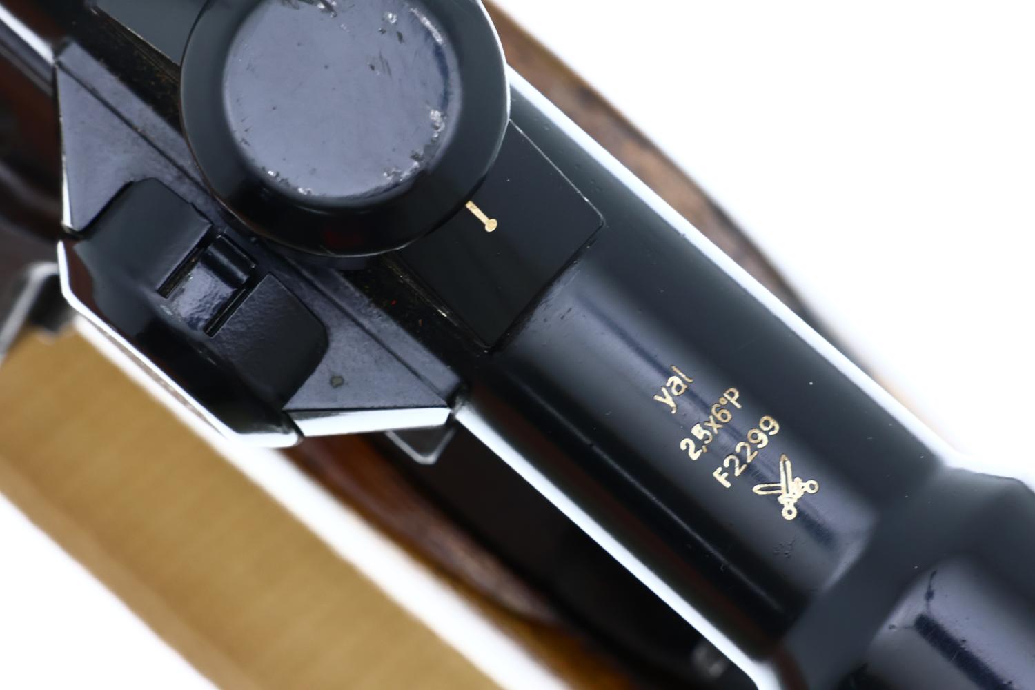Armorers special CZ Vz.54 Sniper Rifle made from a Mosin-Nagant action, cal: 7.62x54mmR, with 27.5″ barrel counterbored at muzzle, hooded post front sight and tangent rear sight graded 1-12. Undated receiver. Mismatched parts throughout: “3321” on the receiver, “C3460” on trigger guard, “V3441” on floorplate, “H4705” on stock, “C3299” on the scope base, “F2299” on scope, and “S3249” on bolt assembly. Fitted with an angled dovetailed scope mount on the left side of the receiver. Fixed power 2.5×6 scope with integral windage/elevation knobs, marked “yal/power/”F2299″/ logo on top. Smooth wooden pistol grip stock with a canvas sling.