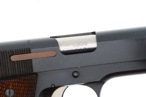 Extremely high original condition Star Model B, extensively marked with matching numbers, as issued to the German Hessen police circa 1952, later imported by Century Arms and repackaged in period correct box with two spare magazines. SN: 376902. Cal. 9mmP. Standard configuration post war Star Model B with fixed front sight and drift adjustable rear sight. Left side of slide with the usual two line address denoting Star’s location and caliber. Barrel hood marked “Cal.08” As was true for the LPN contract pistols, many of the parts were marked with the last three digits of the serial number including the slide stop, left side of slide, left side of safety, barrel hood, barrel bushing and the matching magazine. Hessen Police marking on butt adjacent to the “B”. Small import marking on frame in front of trigger guard. Checkered walnut grips each panel secured with two screws. Complete with generic Star shipping box with renumbered yellow end label specifying model and caliber. Serial number of closely numbered gun has been marked out. No instruction booklet. Two spare arsenal re-dipped magazines with unmarked floorplate, one electropeciled “936” on spine, the other electropenciled “210” on spine.