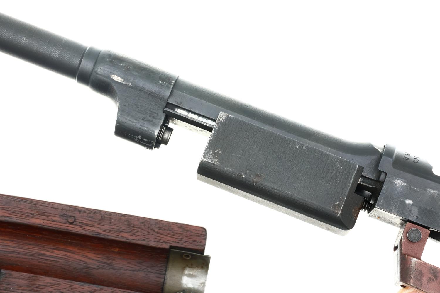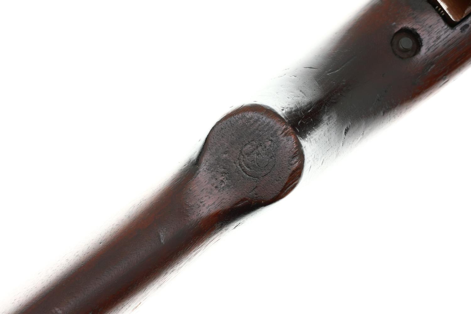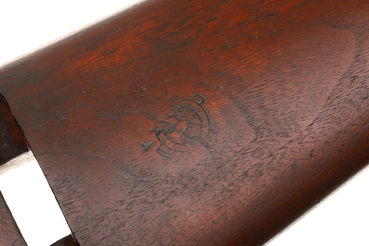 VG overall as one might expect from a battle rifle that was used in the field for nearly two years, likely undergoing at least a partial rebuild as reflected by the National Postal meter plum-toned trigger housing. Missing floor under bolt stop pin, allowing recoil spring visibility, does not interfere with bolt’s function. Red paint added to front and base of rear sight. Dark oiled stock with scattered handling marks, no cracks. Bright bore with shallow erosions, good rifling. Correct manual mechanics.