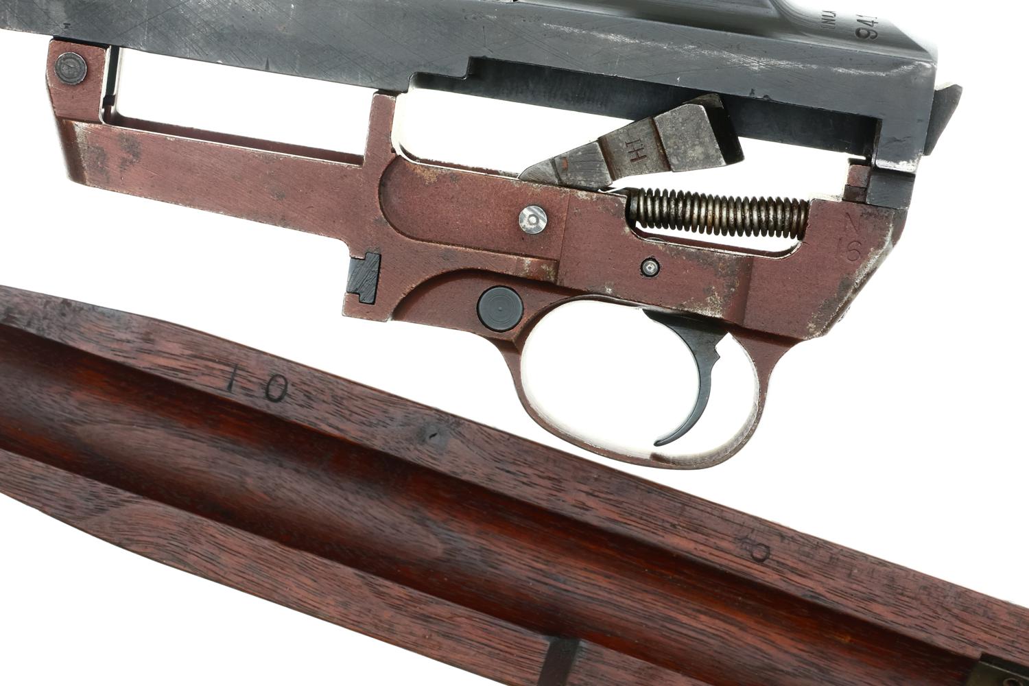 The M1 Carbine was designed as a lightweight alternative to the full-size M1 Garand rifle, weighing only about 5.2 pounds compared to the Garand’s 9.5 pounds. This example was made by Inland Division in 1943 with 15 shot magazine. Barrel marked “Inland MFG DIV, General Motors, dated 9-43”. Front of receiver marked “U.S. CARBINE CAL. 30 M1” while the rear of the receiver is marked “INLAND DIV” over the full serial number “941038”. Fitted with winged front sight, Inland barrel band, “S”/unmarked L-flip rear sight, blued flat bodied bolt, a high wood walnut stock marked with an encircled P under the pistol grip, a large Inland logo on the right side of the butt, and the sling recess on left side marked with the “IO” subcontractor. Disassembly showing a plum tone National Postal Meter “N/16” marked trigger housing and an “HI” hammer, inner channel of handguard marked “IO”. Complete with a 15-shot magazine, back spine marked “UQ”.