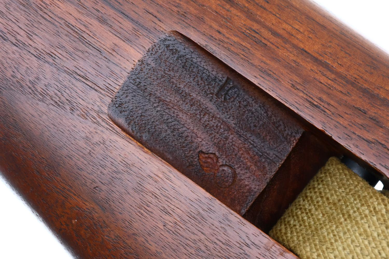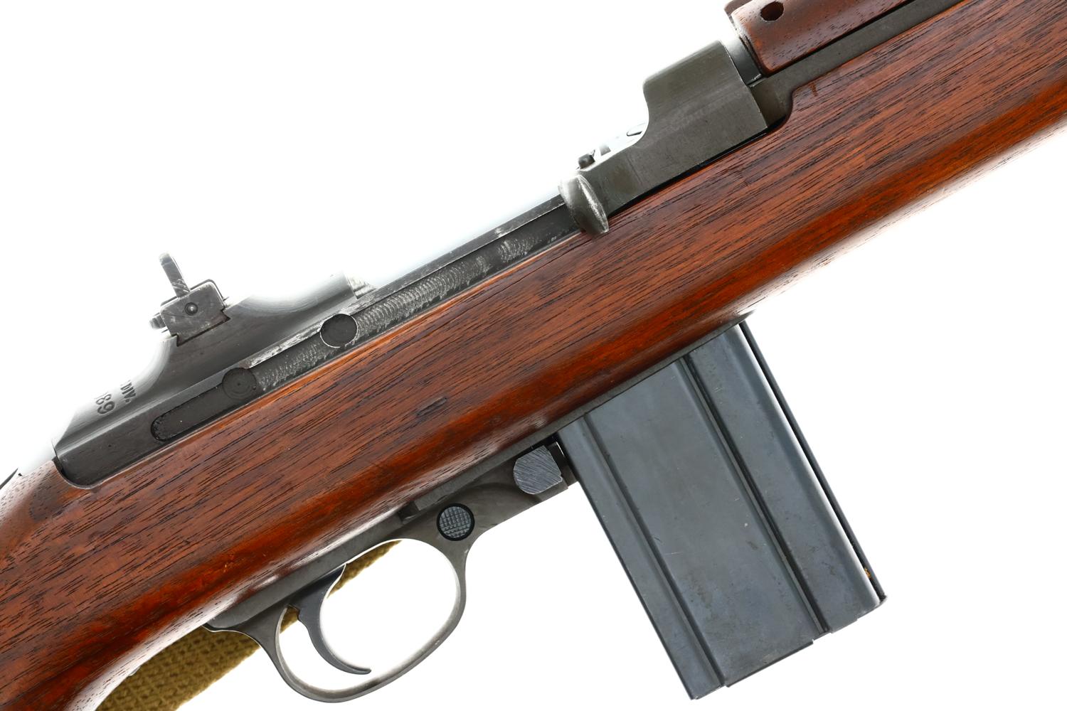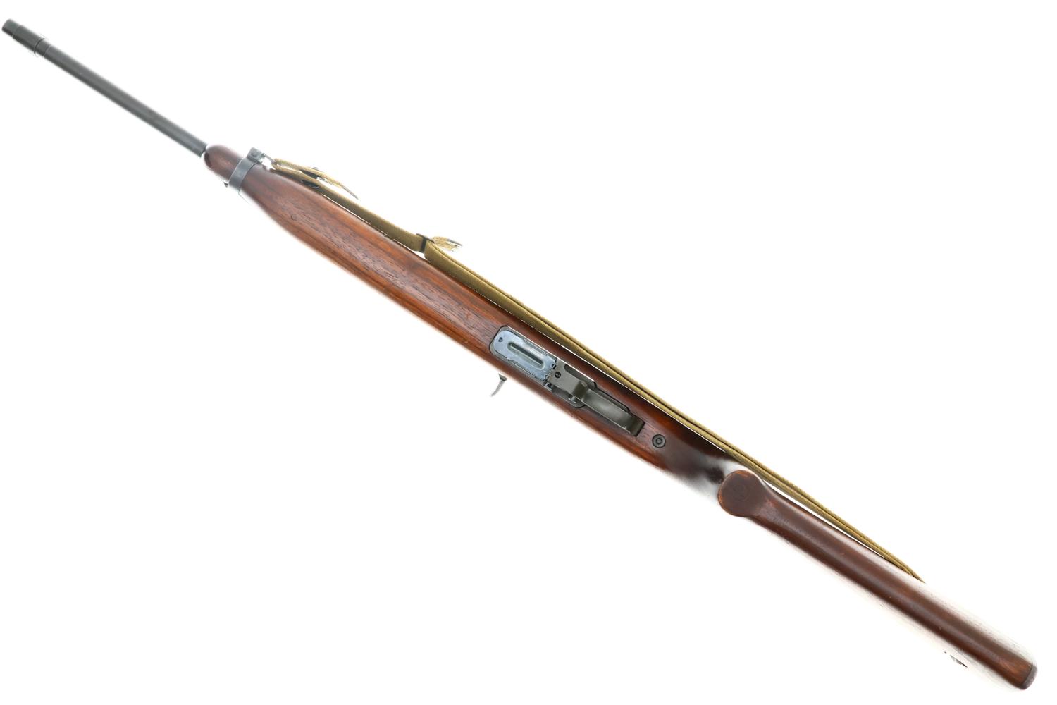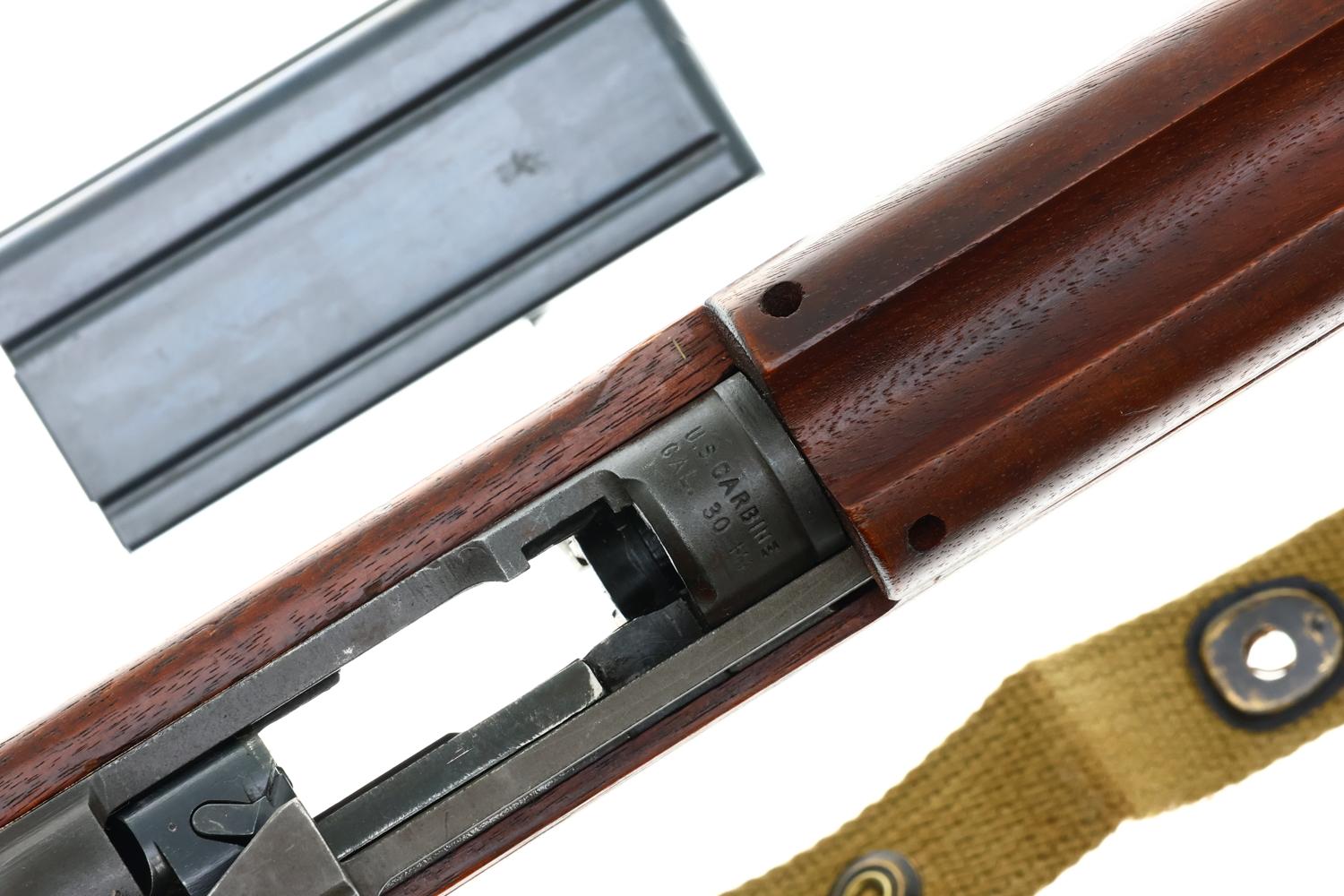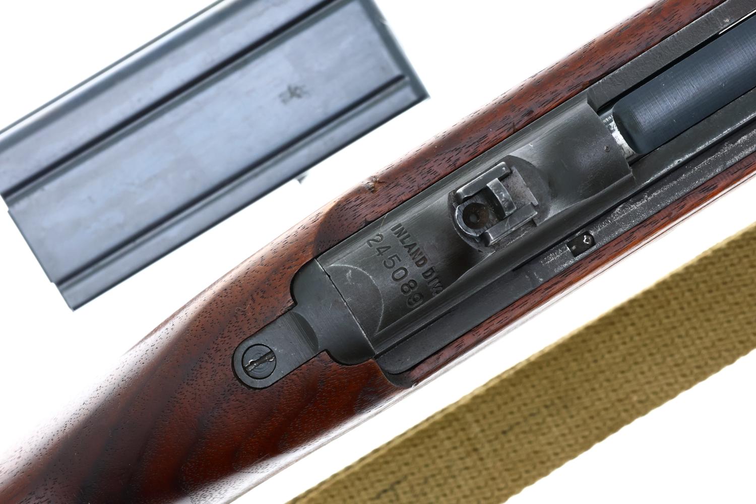 The M1 Carbine was designed as a lightweight alternative to the full-size M1 Garand rifle, weighing only about 5.2 pounds compared to the Garand’s 9.5 pounds. This example was made by Inland Division in 1942 with 15 shot magazine. Barrel marked “Inland MFG DIV, General Motors, dated 2-43”. Front of receiver marked “U.S. CARBINE CAL. 30 M1” while the rear of the receiver is marked “INLAND DIV” over the full serial number. Fitted with winged front sight, “S”/unmarked L-flip rear sight, blued flat bodied bolt, a high wood walnut stock marked with an encircled P under the pistol grip, a large Inland logo on the right side of the butt, and the “I” cut sling recess marked on left side with the Flaming Bomb and “IO” subcontractor. Disassembly confirming an Inland marked trigger housing. Canvas shoulder strap and unmarked 15-shot magazine.