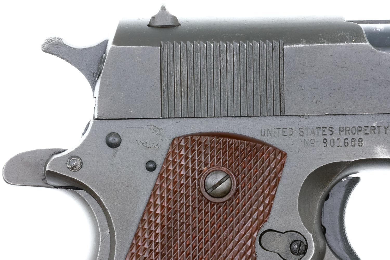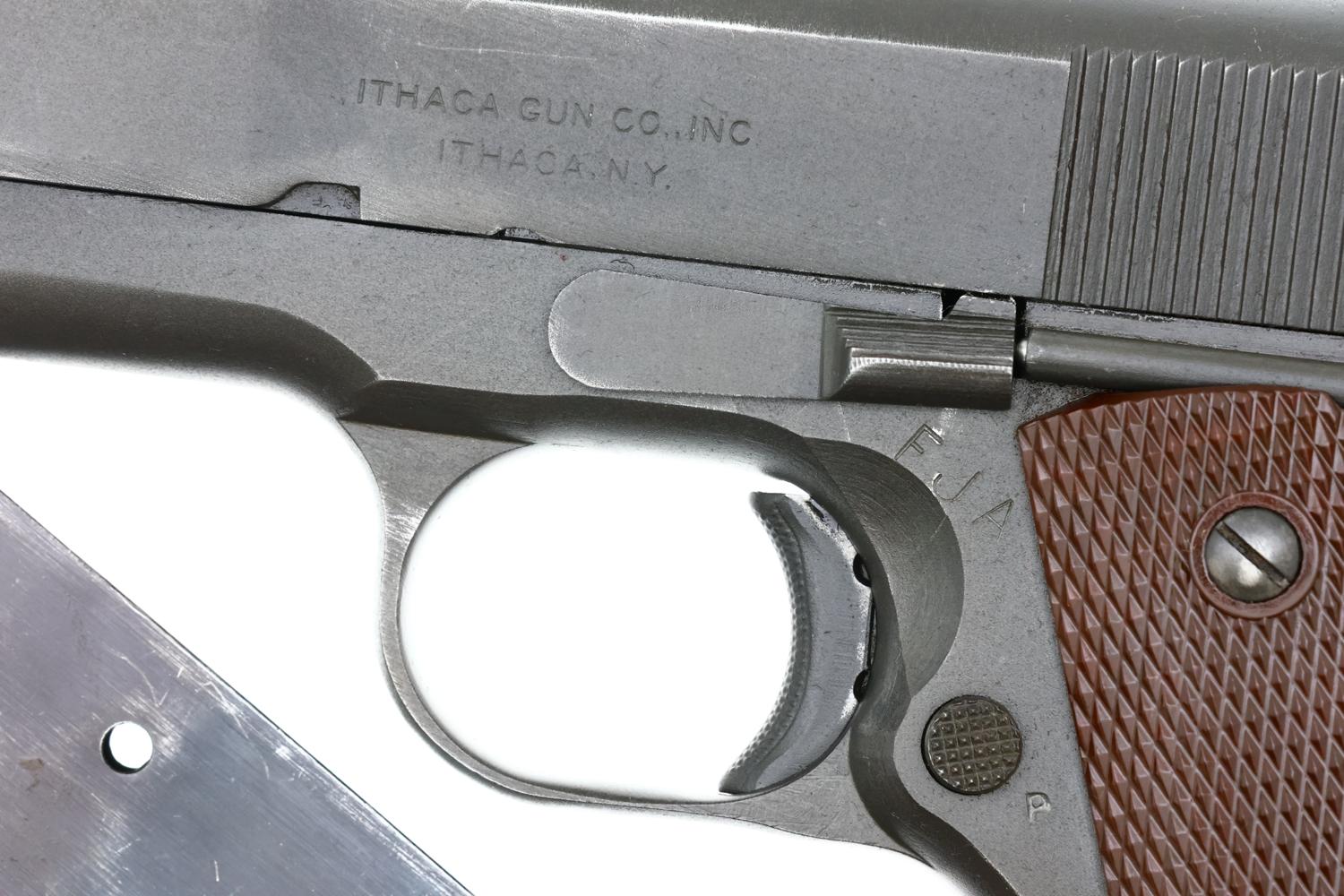Attractive, original condition Ithaca Model 1911A1 U.S. Military WWII Pistol assembled in 1943, parkerized slide and frame with blued small parts, near mirror bore and correct magazine. A wonderful addition to any collection of WWII military pistols.