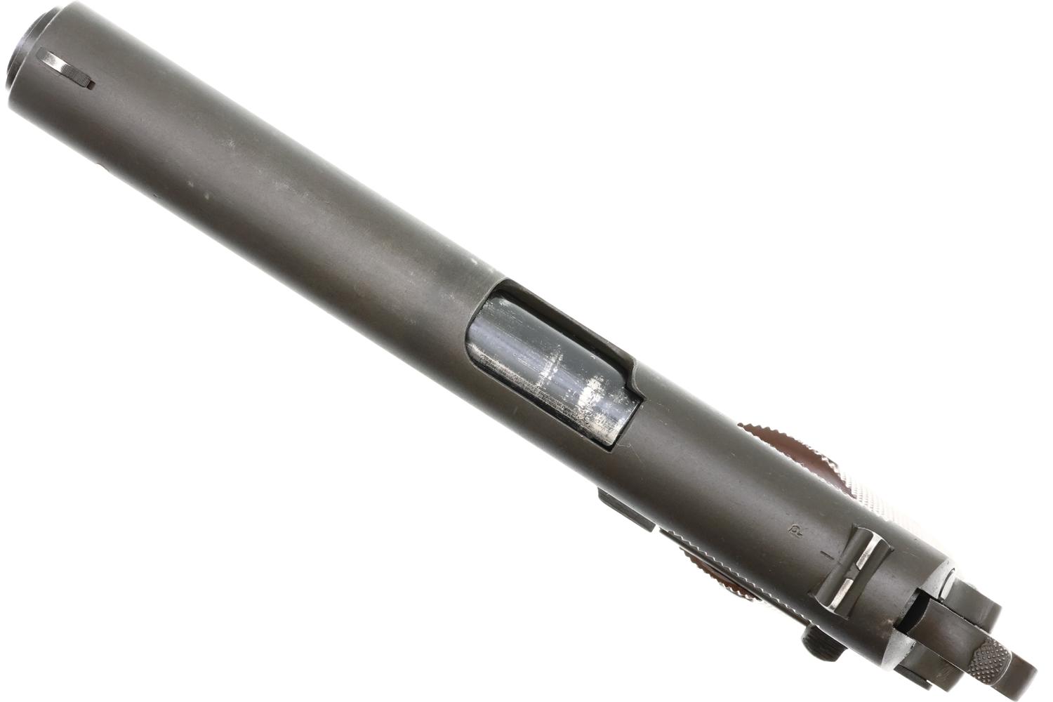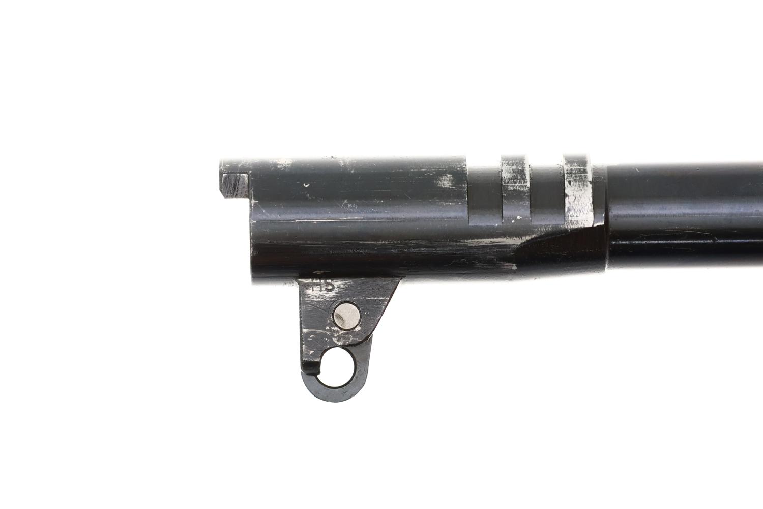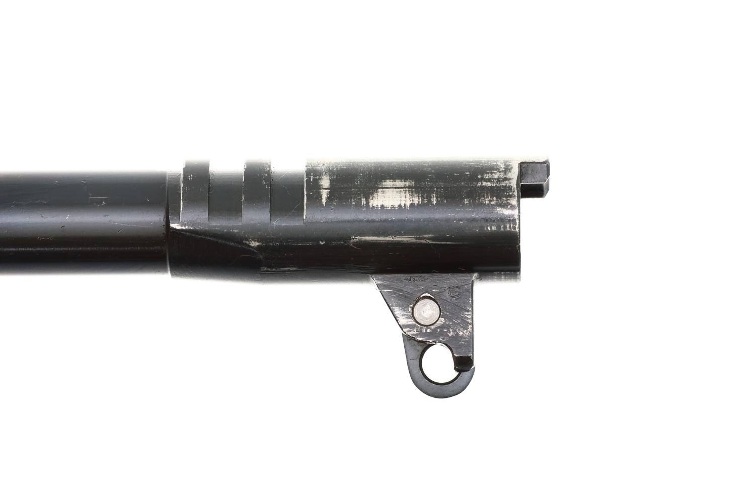 Standard configuration 1911A1 manufactured by Ithaca in 1943, the left side of the slide marked with the usual two-line Ithaca address. The model designation, SN, and U.S. ARMY / property markings are on the right side of the frame. Ordnance wheel on right side of frame breaks through the parkerizing as do the “P” on top of the slide, the “P” on the left frame below the magazine release, and the “FJA” inspection mark. The barrel lug is marked with an ‘HS’ (High Standard) and ‘P’, as is correct for an original assembled pistol. Fitted with blade and notch sights, serrated slide release, thumb safety, narrow checkered hammer, and short grip safety. Checkered Keyes Fiber grips with screw head reinforcements. Correct blued magazine marked with an ‘L’ on the toe. Complete with later production, high quality reproduction box, no tape marks, with oilskin paper, serial numbered to pistol.