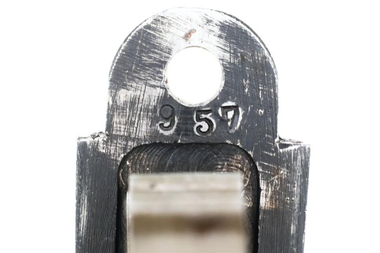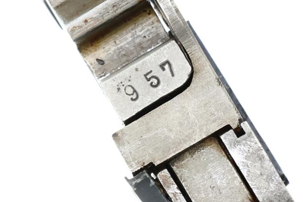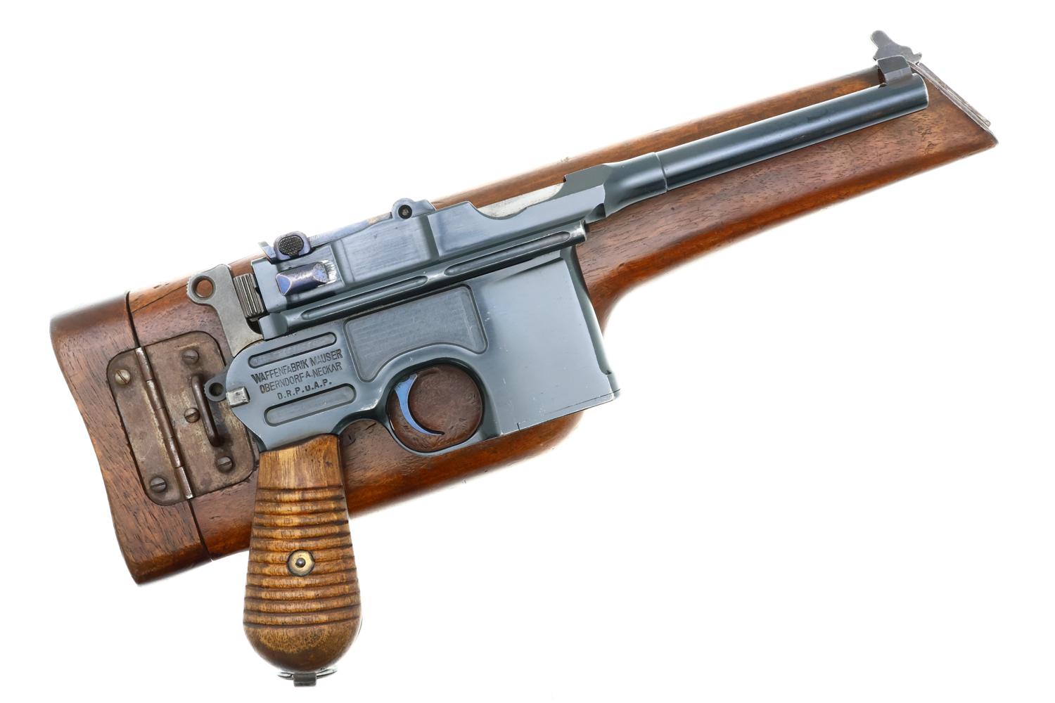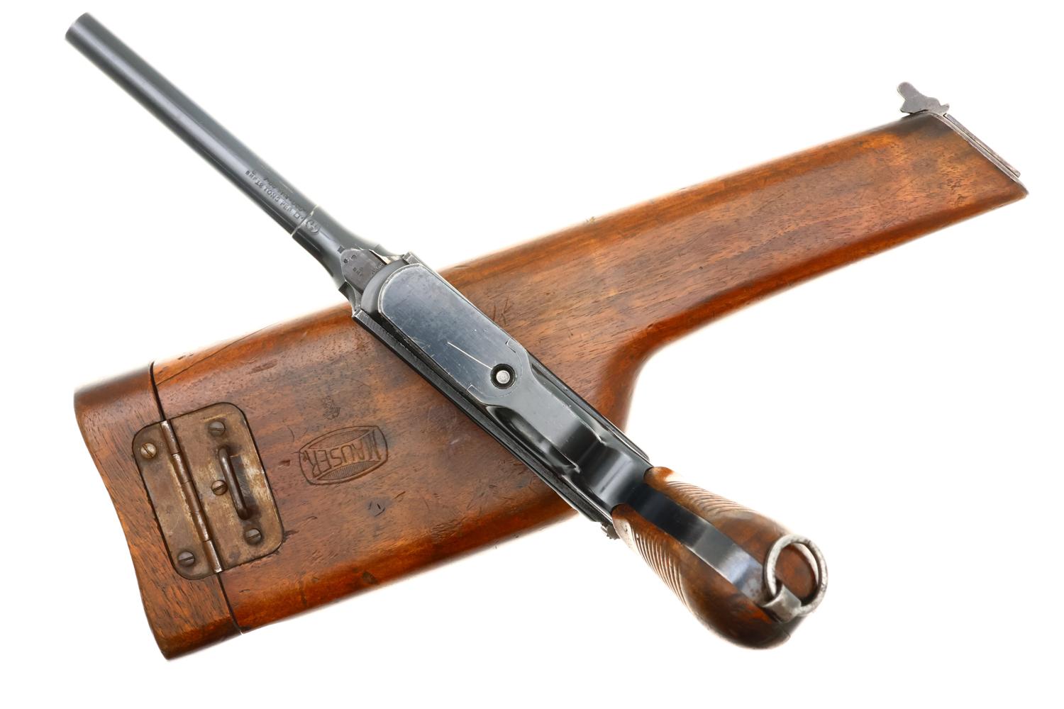 Near EXC, all matching pistol with bright original salt blue finish with sharp edge wear in the usual locations, a noticeable scratch at the bottom of the magazine floorplate. Comparable condition fading of the fire blued parts, particularly over the crest of the sight cursor and bolt stop. Grips retaining the majority of their lightly applied finish with a scattering of handling marks and an occasional bruise. Mirror-bright bore. Correct manual mechanics. G shoulder stock with oil darkening, a scattering of handling marks, and a two-inch crack extending down the body from the right of the faded, brown-toned hinge. Stock is a superb fit to the pistol, the lug slipping in smoothly, the attached pistol with virtually no wobble.