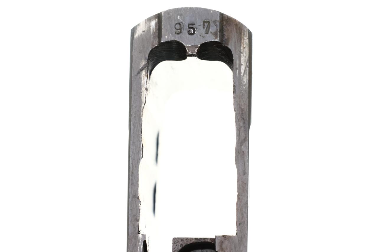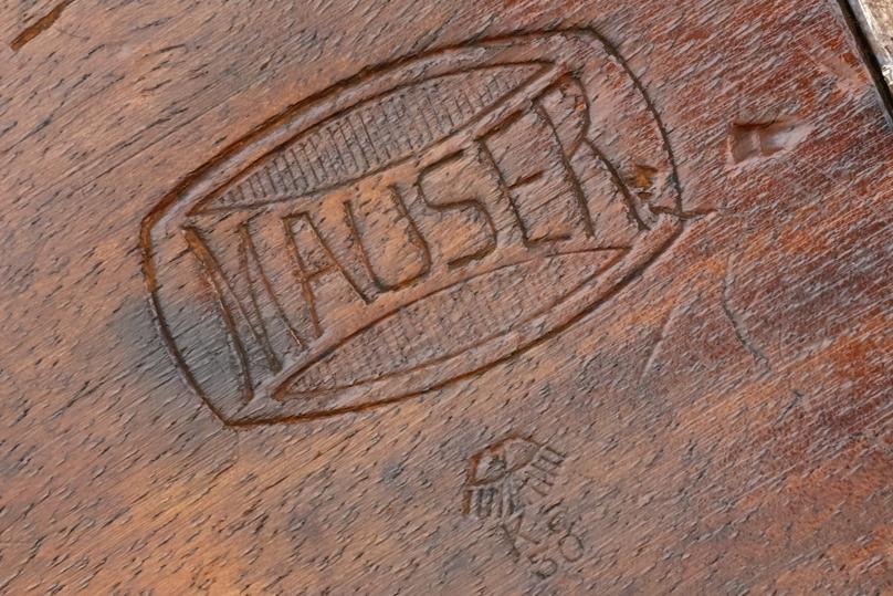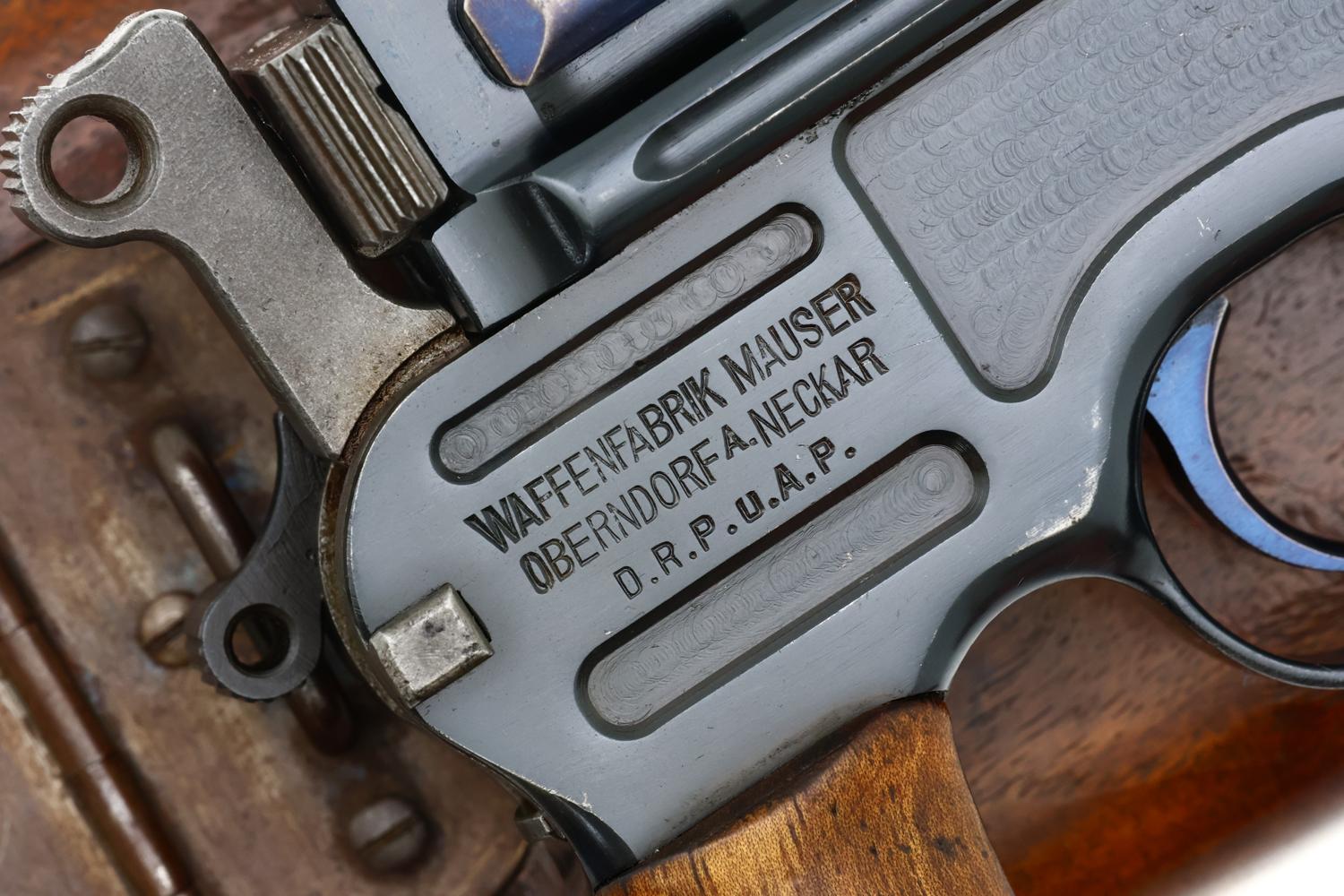 Early configuration Mauser 1930 Commercial Broomhandle, British proofing under 5.25 inch barrel having fixed front sight and slip-in rear sight graduated from 50-1000 meters. Short extractor, two-lug firing pin, universal safety. Three-line Mauser address on top chamber flat, crown/crown U on left flat, full serial number on left side of barrel extension. Fat Mauser banner on left frame panel. Right side of frame marked “WAFFENFABRIK MAUSER / OBERNDORF A. NECKAR / D.R.P.u.A.P.” Major parts finished with a high polish salt blue, small parts heat treated to a fire blue. Fitted with broadly serrated walnut panels. Original lanyard ring present. Complete with correct Mauser Banner shoulder stock with unnumbered square shoulder lug, this stock unusual in having a “Eagle /Ka 30” military proof below the Mauser banner.