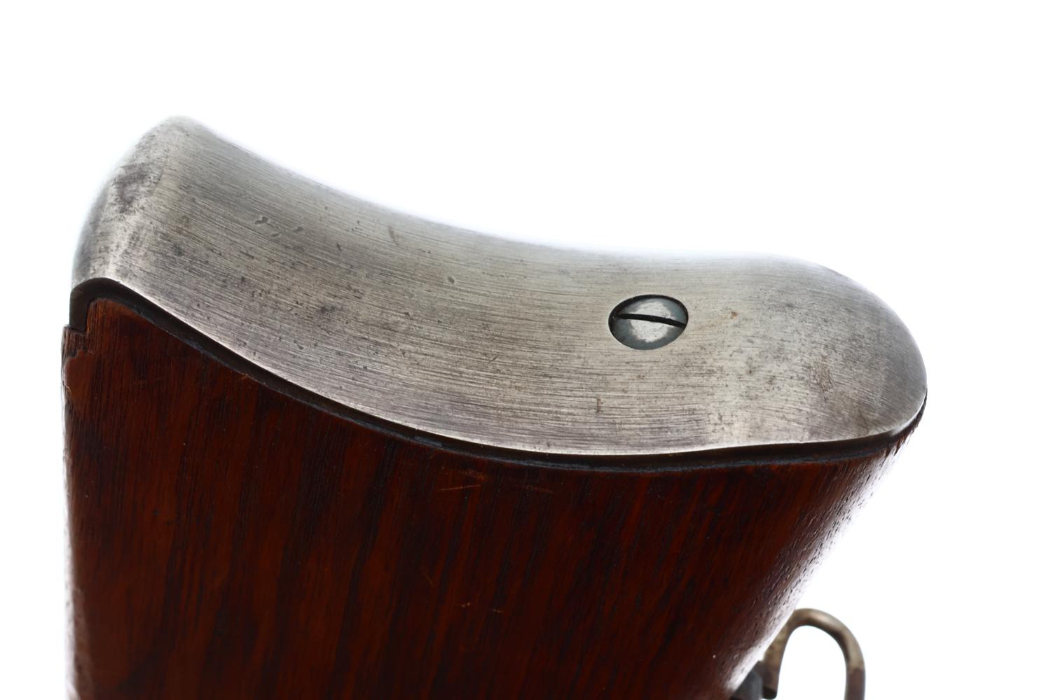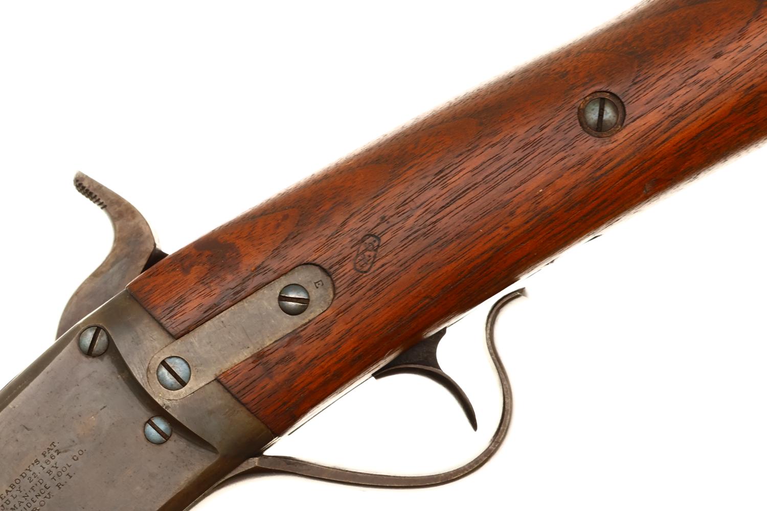 In 1862 Peabody patented a breech-loading rifle but was unable to perfect it in time to play a major role in the American Civil War (1861-1865). This rifle, made circa 1866-1871, was cartouched, on the stock, a recognized mark that was apparently applied for rifles and carbines earmarked for export. This example has a 33″ blued rifled barrel with a fixed bayonet stud/blade front sight and a height adjustable rear sight notch graded 1-9. Color case hardened action, marked on the left side with a five line Peabody’s patent and Providence Tool Co. address. Many components were marked with the letter “E”, “U”, “S” or “H”. Fitted with a nearly full length walnut forearm with ramrod, secured with two barrel bands and a straight wrist stock that has the small oval “WC” cartouche on the left side and smooth, curved metal buttplate. ANTIQUE.