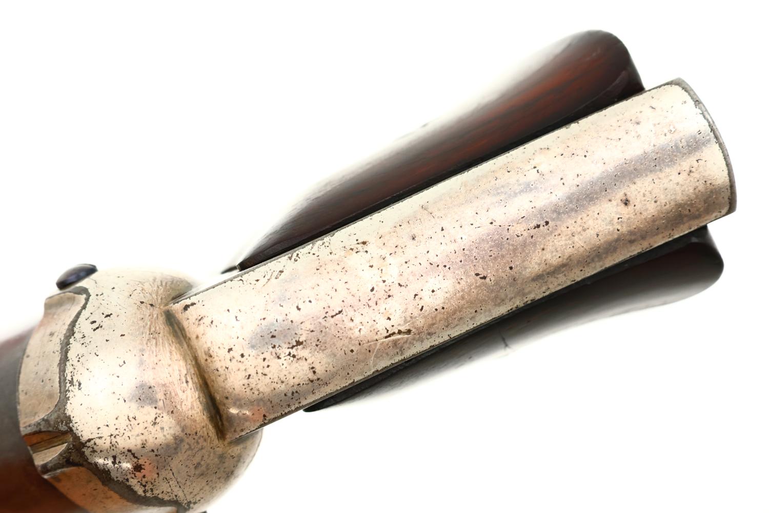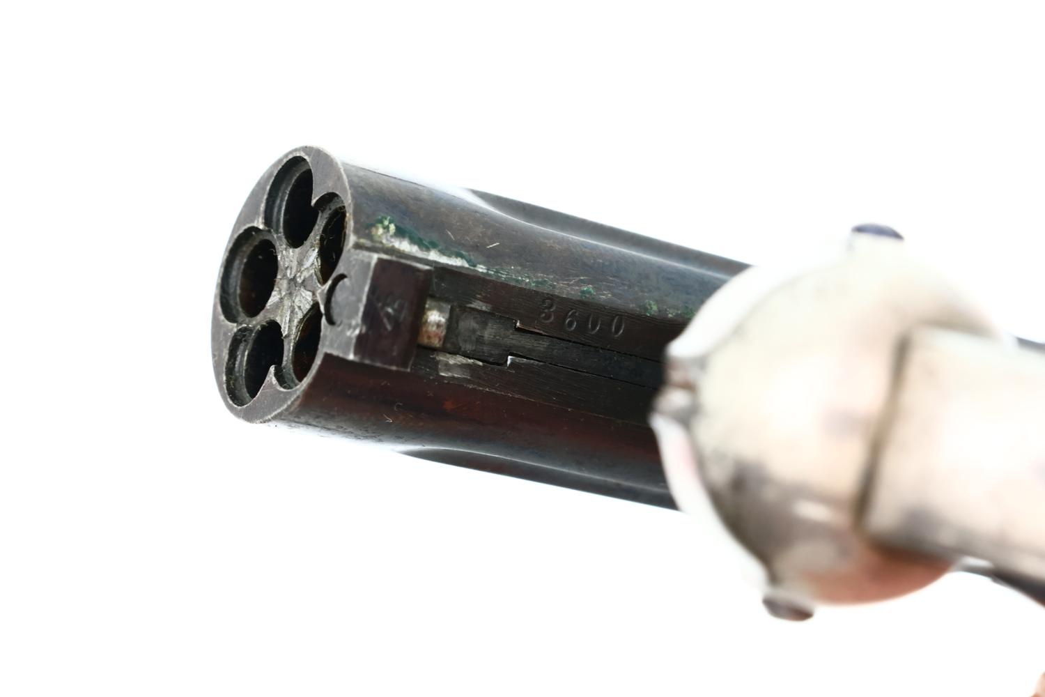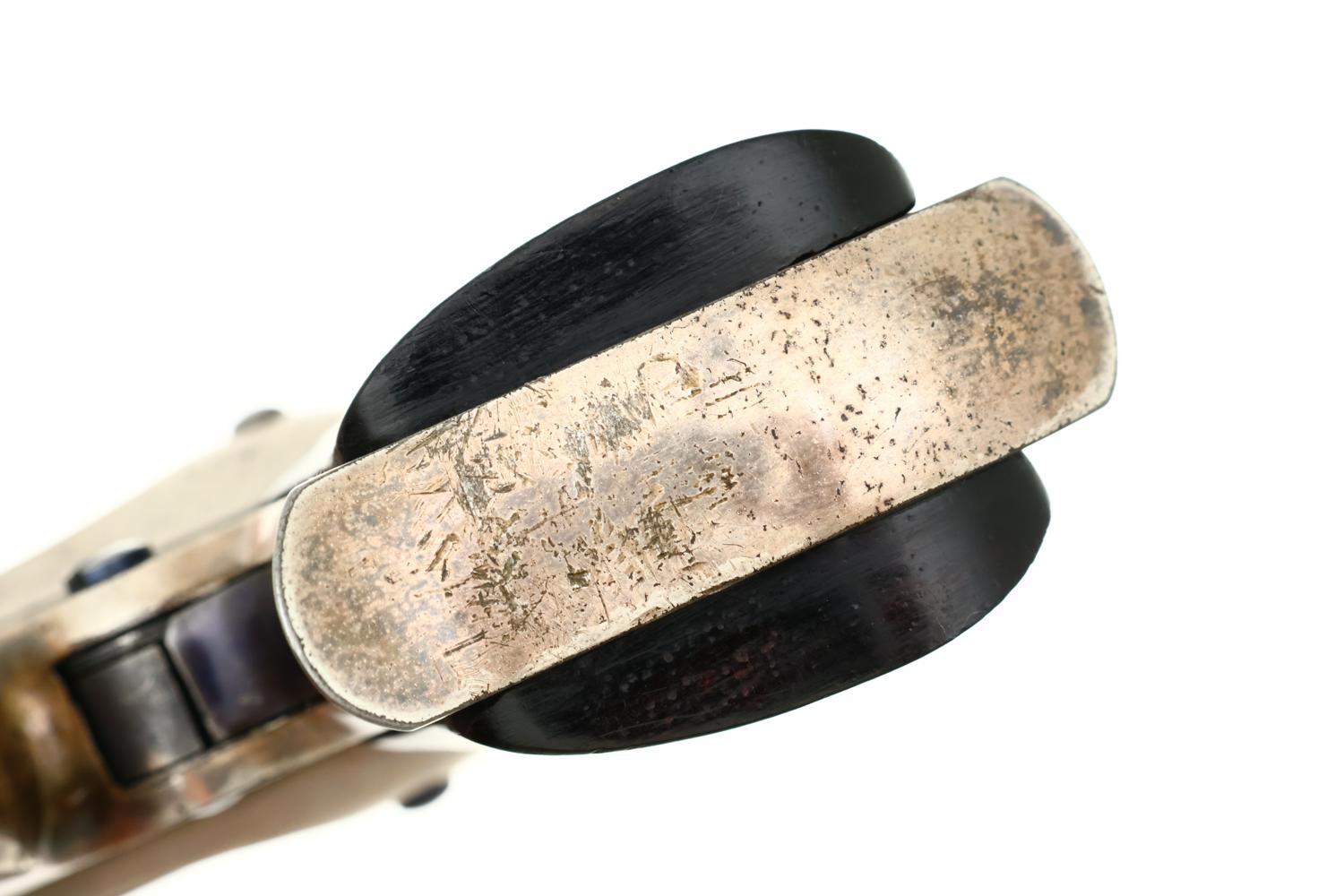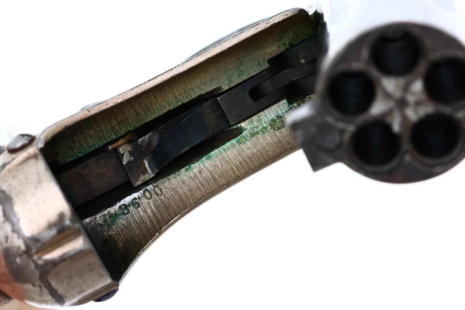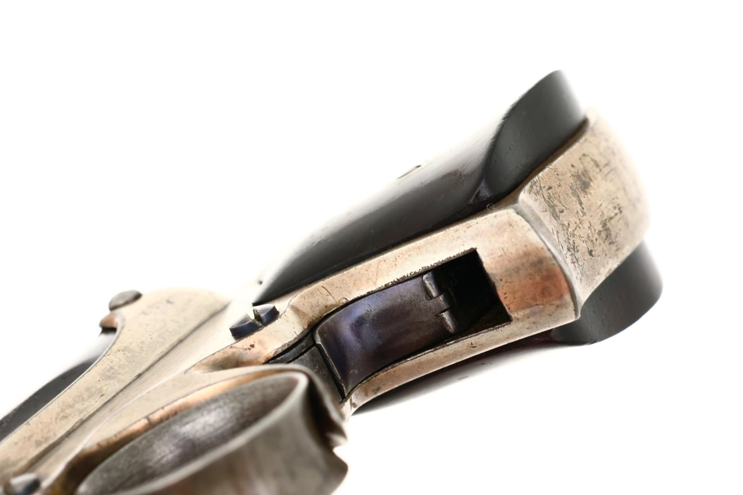 Standard configuration Remington-Elliot Pepper Box Revolver, SN: 3600, cal. .22, manufactured from 1863 to about 1880, with a blued 3-inch, five-barrel cluster, the firing accomplished with a rotating firing pin actuated by the DA-only ring trigger. Bead front sight and groove rear sight. Nickel-plated frame #3600 with ring trigger design typical of Civil War era pocket pistols. The top of the barrel assembly is marked “MANUFACTURED BY E. REMINGTON & SONS, ILION, N.Y.” / “ELLIOT’S PATENTS MAY 29, 1860 – OCT 1, 1861”, with matching serial number “3600” marked underneath, visible when the assembly is tilted up for loading. Dark wooden grips, each secured with a single screw. A wonderfully complex mechanism, representing one of the final iterations of the pepper box design before being superseded by conventional revolvers.