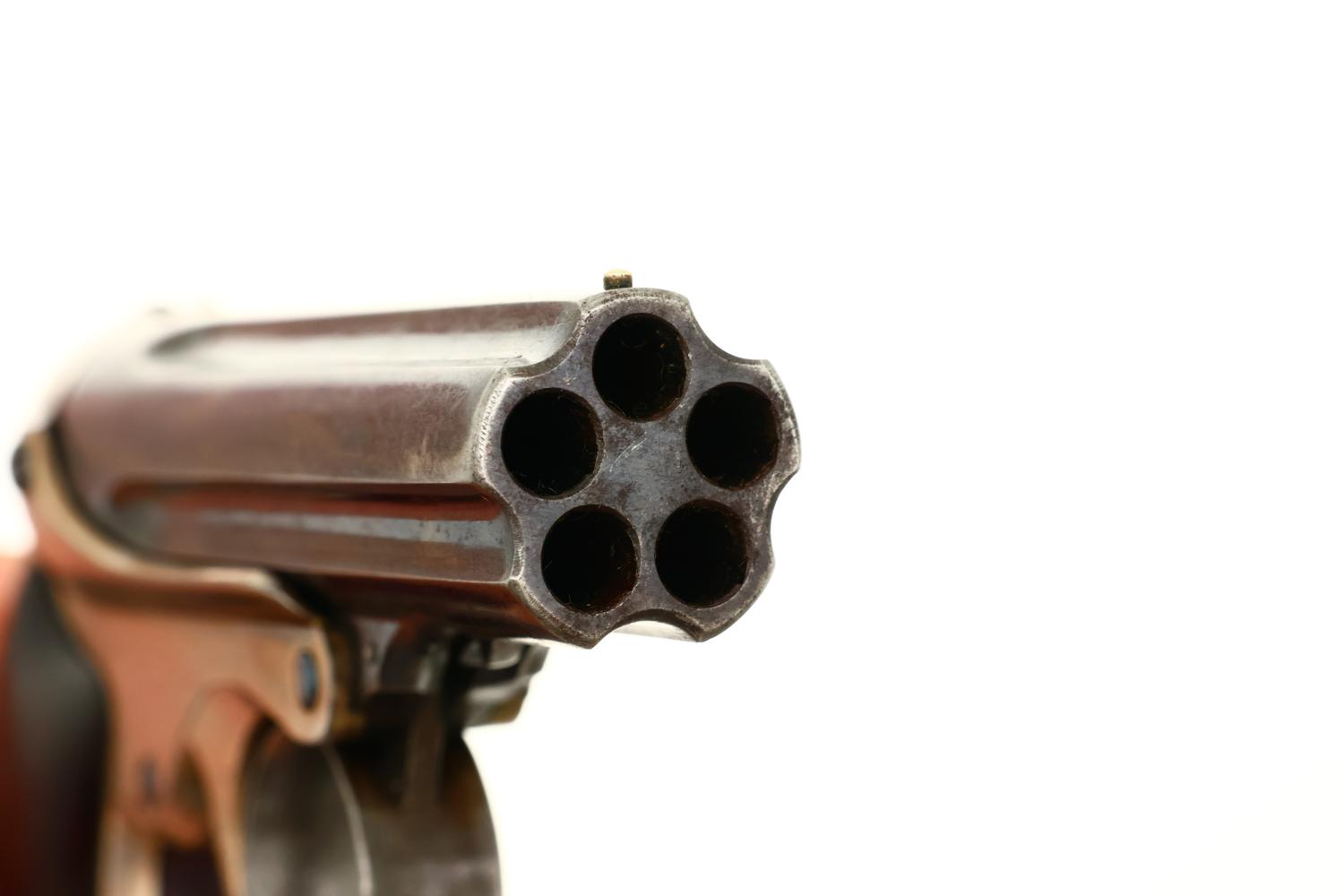 Wonderful, original condition and all-matching Remington-Elliot pepperbox derringer, cal. .22 rimfire, with a five-barrel complex, fired by a ring trigger that actuated a revolving firing pin. The epitome of the pepper box iterations and a popular 19th century choice for concealed carry applications. ANTIQUE!