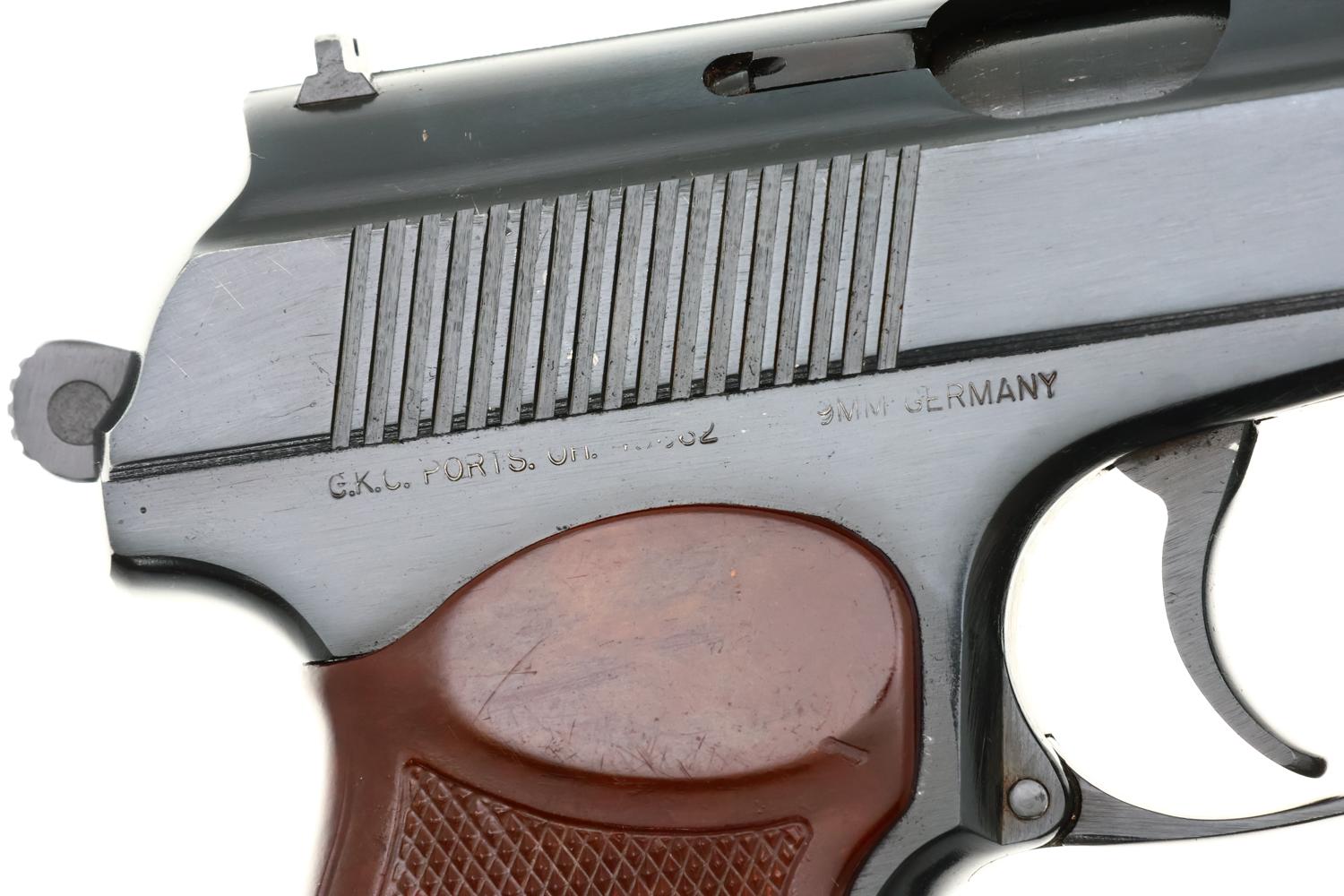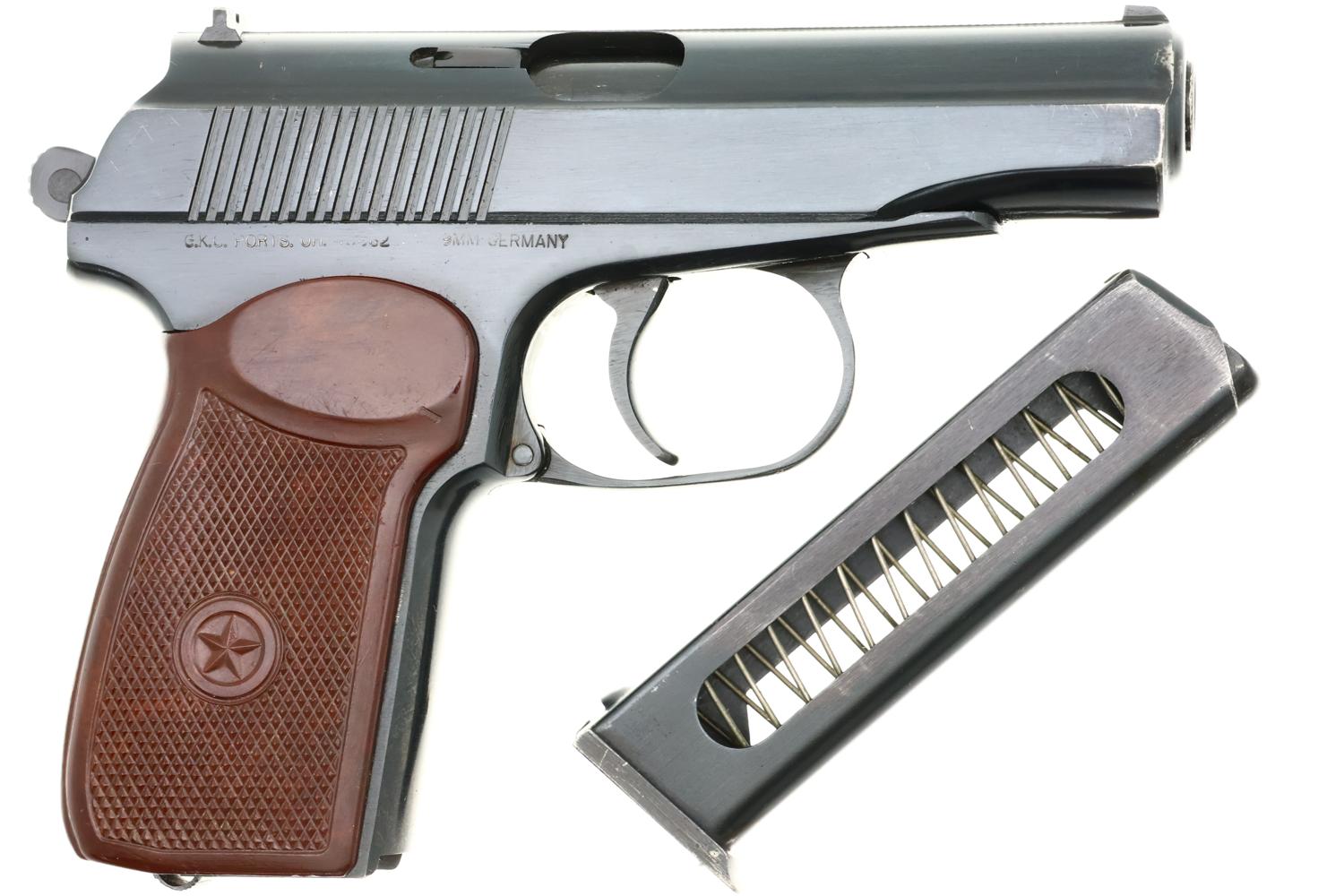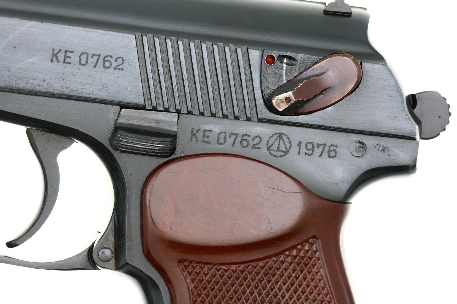 Standard configuration Makarov with fixed front sight and drift adjustable rear sight. Full serial number on left side of slide and left side of frame followed by Izhevsk Arsenal marking and manufacturing date of “1976”. Plum-toned safety and late, Bulgarian-style magazine electropenciled “836-2”. Import markings as imaged. Single piece reddish maroon plastic grip with two checkered panels impressed with encircled 5 pointed star and fixed lanyard loop.
