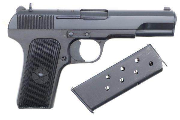 Superb as new Chinese Tokarev made in 1981 in factory 66 with three Chinese characters on top of slide surmounting serial number that is repeated on the left side of the frame. Assembly markings on either side of upper trigger guard web. Fitted with vertically serrated black plastic panels with central 5 pointed star, the left panel recessed for a fixed lanyard ring. Magazine with 6 indicator holes and detachable floorplate matched to the last four digits of the serial number.