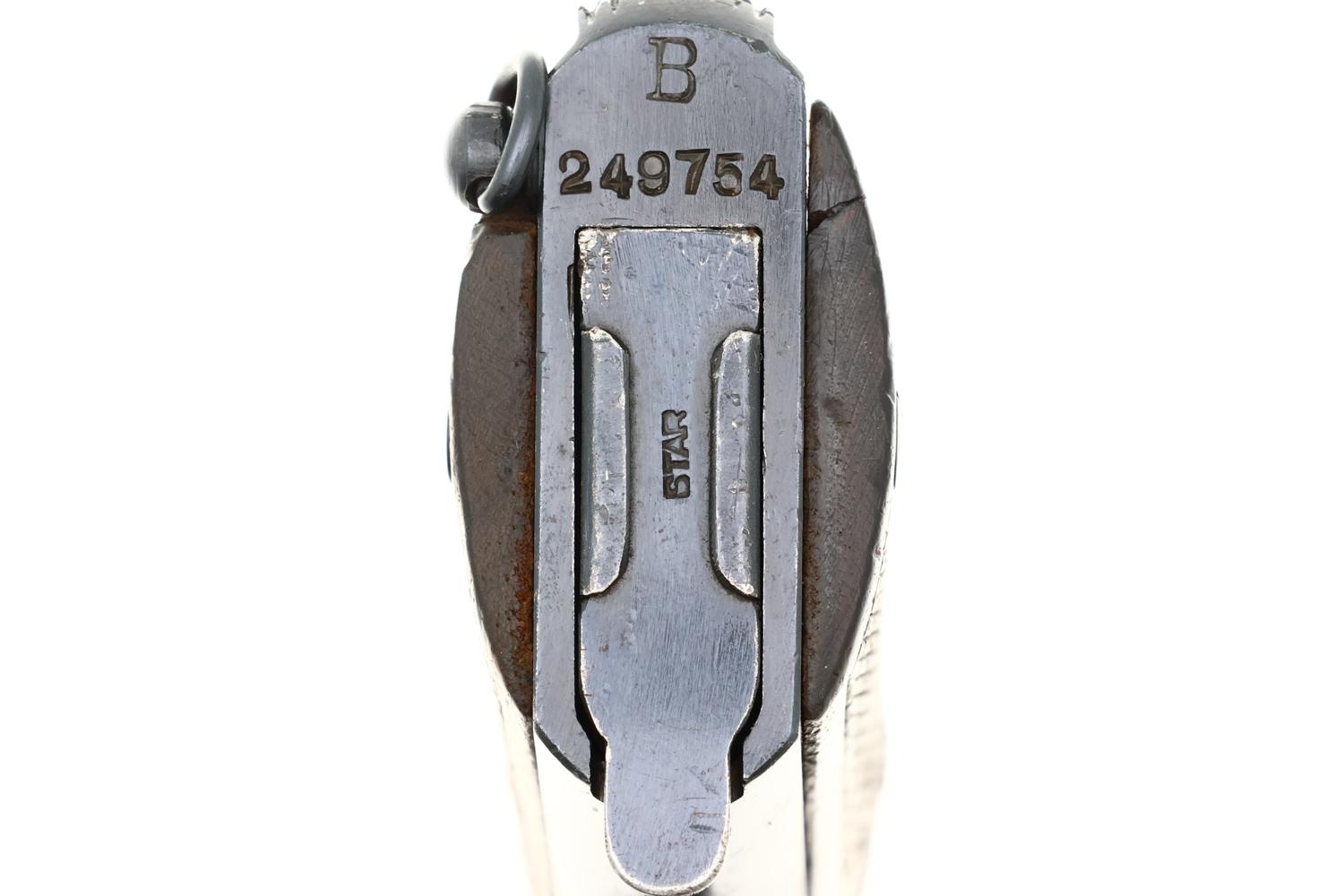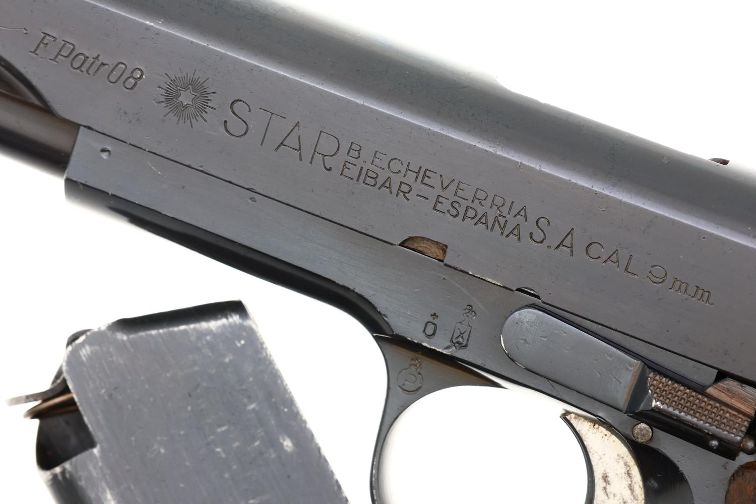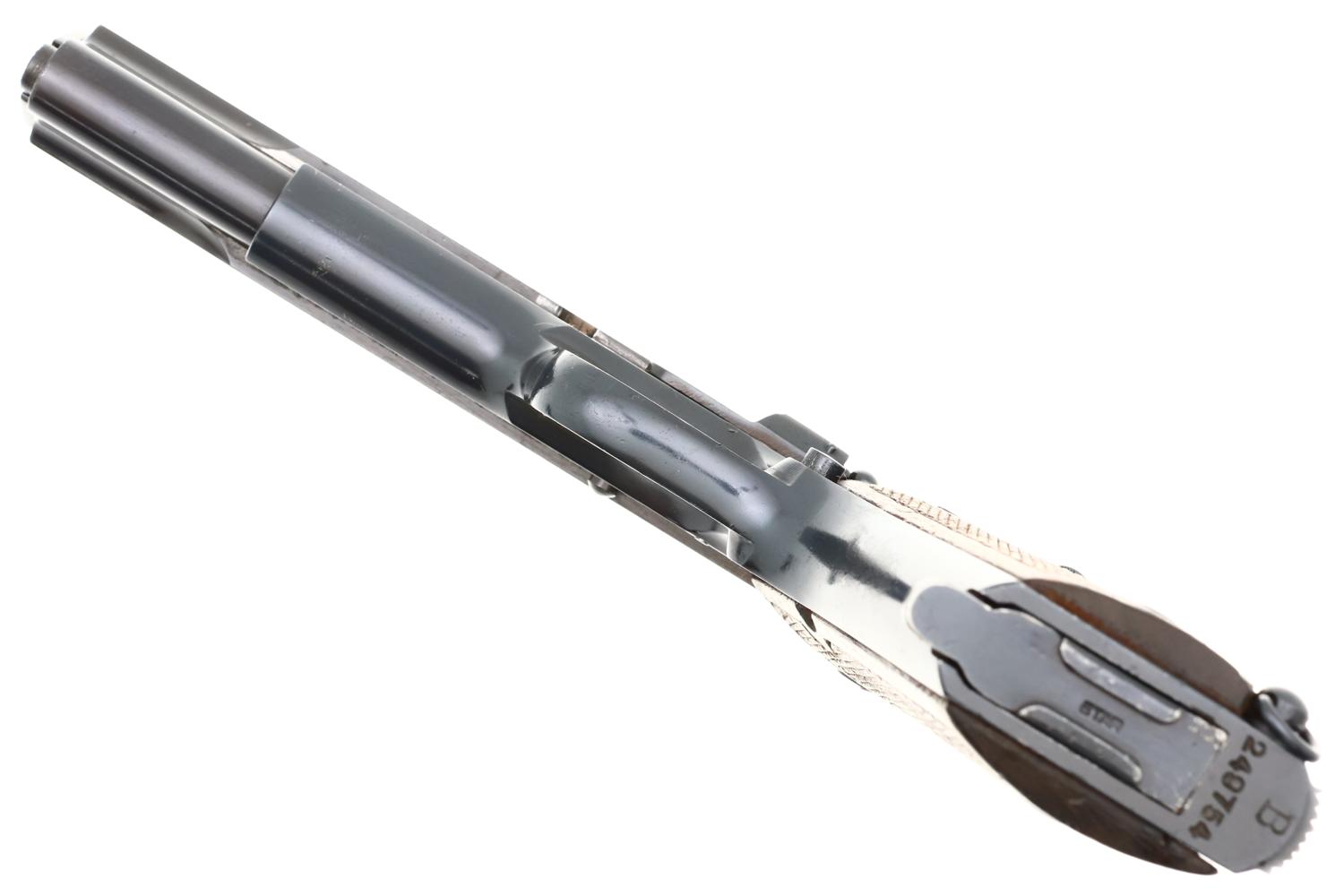 Star Model B pistol in 9mmP made under contract for the German World War II military and delivered in a group of 8,000 pistols on June 14, 1944. Standard configuration with fixed front sight and drift adjustable rear sight. Left side of slide marked “F.Patr.08” followed by Star symbol and usual address reflecting Star’s location in Eibar, Spain and caliber 9mm. Usual triad of Eibar proofs on the left side of the frame to include upper trigger guard web with the automatic proof repeated on the left rear of slide and the exposed barrel hood that is additionally marked Cal. 08. but marked with a “B” and the full serial number “249754”. Fitted with large diamond, checkered bordered walnut grips, lanyard ring and a detachable magazine with two indicator slots on the right side and a floorplate marked “STAR”. Nazi acceptance marked on the right tang with an “Eagle/WaA D20”. Identically marked pistols from the same shipment are pictured in the book Star Firearms by Antaris on pages 342 and 365.