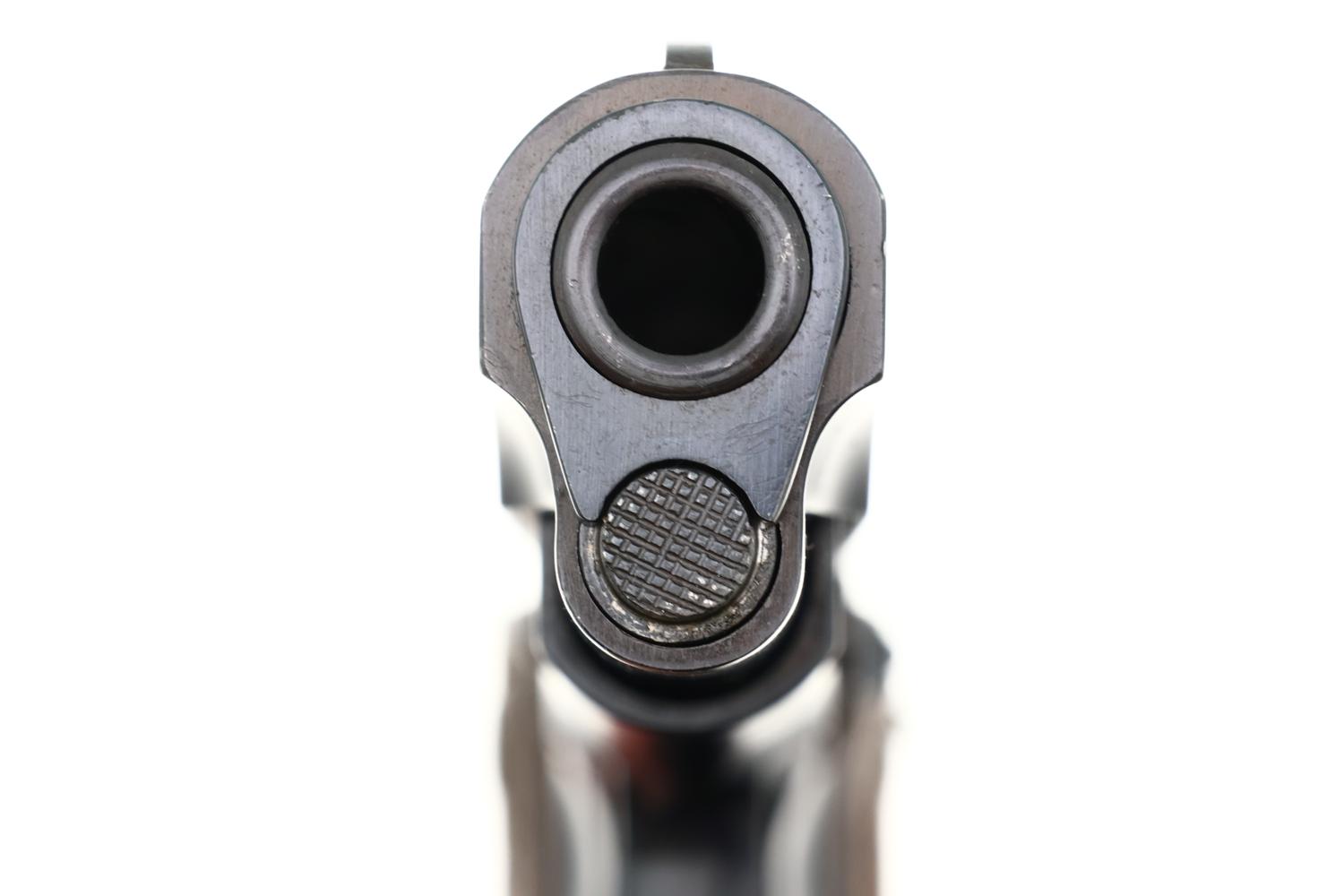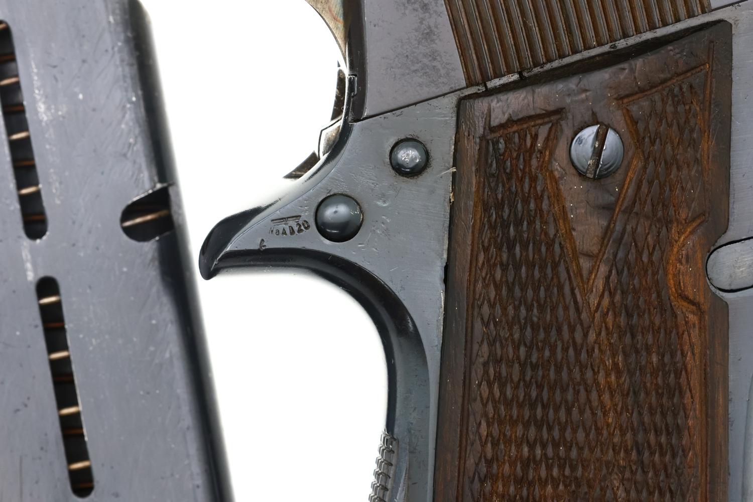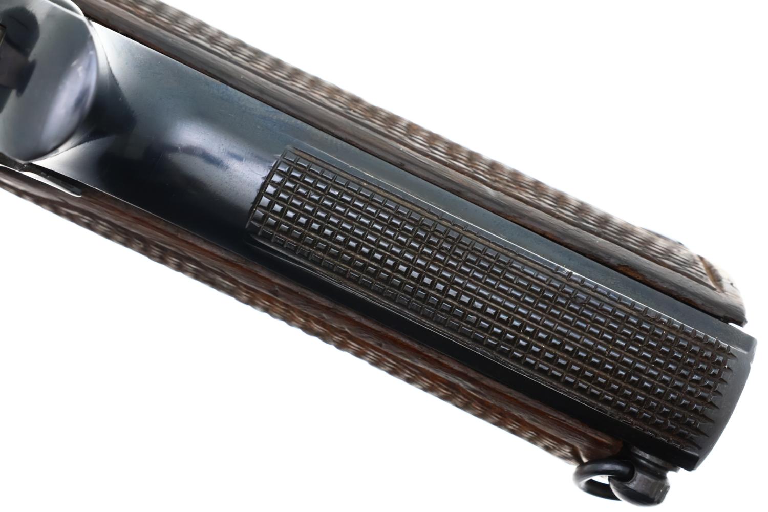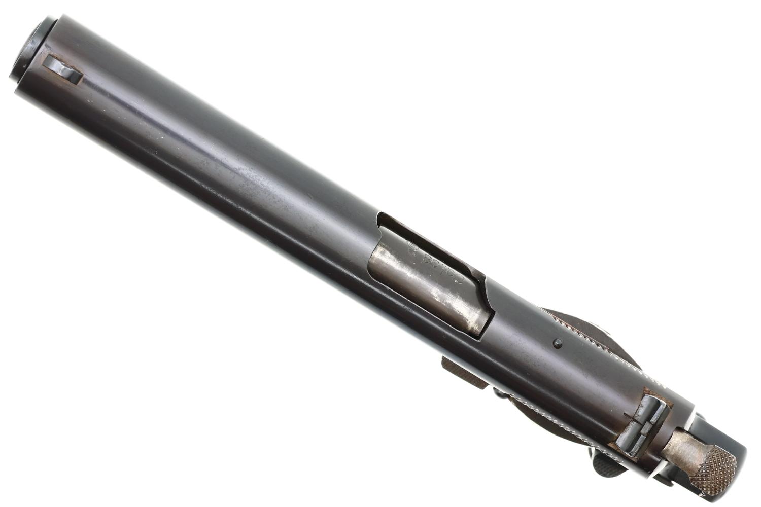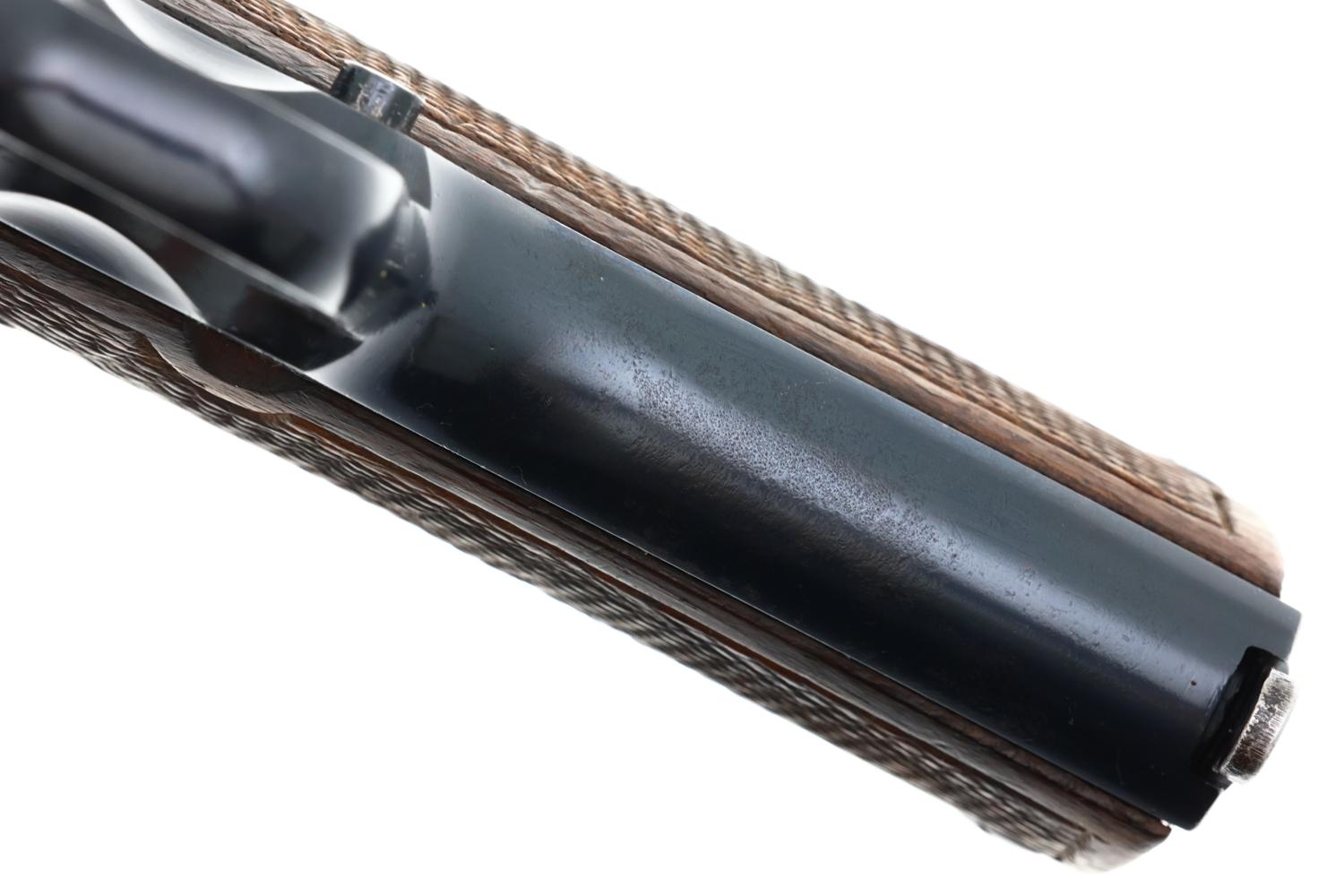 VG-EXC as re-dipped, to include the barrel, the pistol with nearly 99% of the reapplied blue, shallow erosions under the blue on the frontstrap. Hammer retaining the majority of its original color case hardened finish. Original oil-darkened grips with scattered handling marks. Original finish magazine with insertional scuffing. Bright bore with sharp rifling. Correct manual mechanics.
