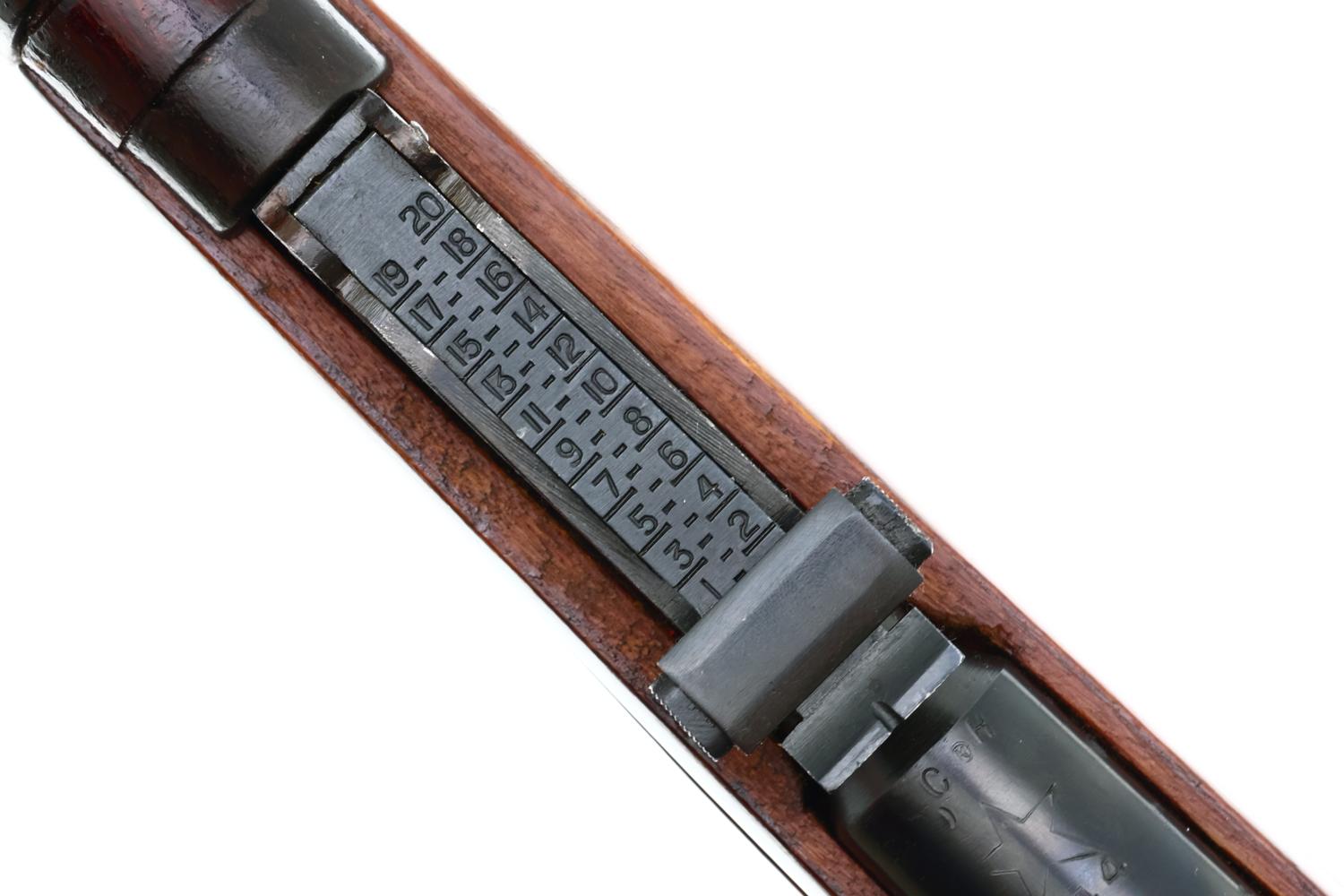 Standard configuration Mosin Nagant 91/30 bolt action rifle dated 1944 chambered in 7.62x54mmR, with a hooded pin front sight, a tangent rear sight graded 1-20, and a standard undated PU scope, whose SN is 4322728. Full SN: GM 909 is on the left receiver; other major components with the “909” include barrel, bolt, floorplate, buttplate, and scope mount (electropencilled with “TM 909” and “4322728, the scope SN). Heavily varnished stock with scattered inspection markings whose SN and arsenal markings are not discernible. Complete with accepted cleaning rod.