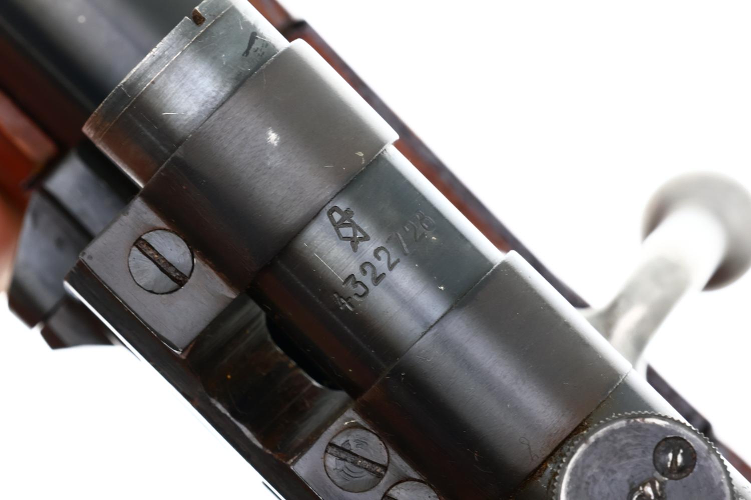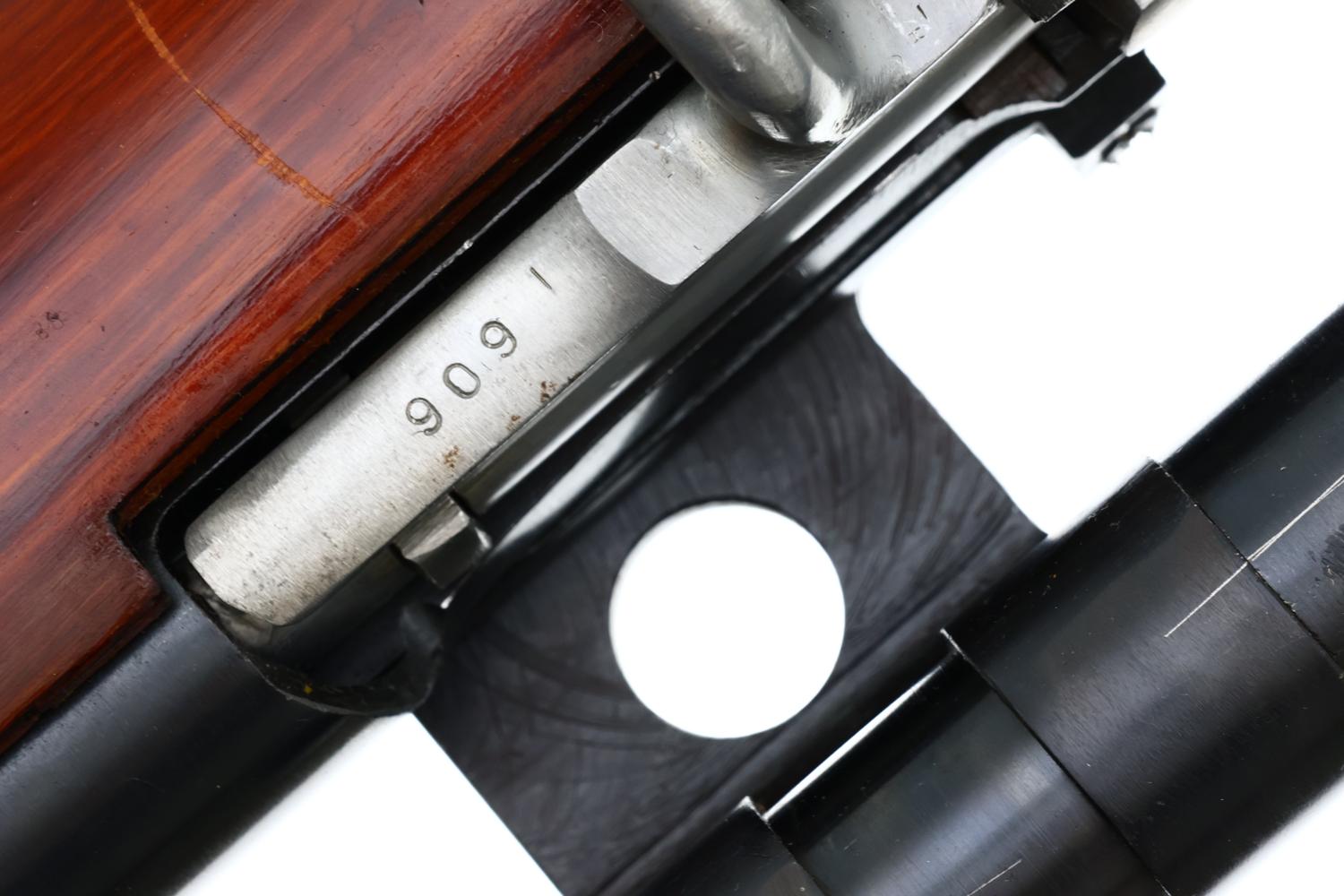 VG+ as arsenal refurbished, now with 99% salt blue finish. Markings on barrel shank and receiver crisp and nicely haloed. EXC original finish scope with a sharp reticle, slightly yellowed optics. VG/VG+ refurbished stock with scattered handling marks, several fresh appearing scrapes on the right side of the buttstock. Mirror bright bore. Correct manual mechanics.