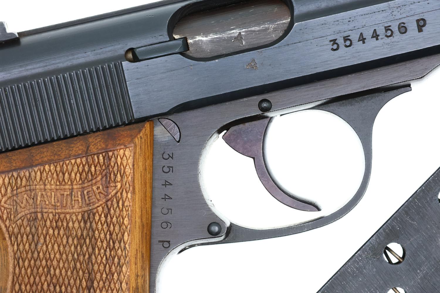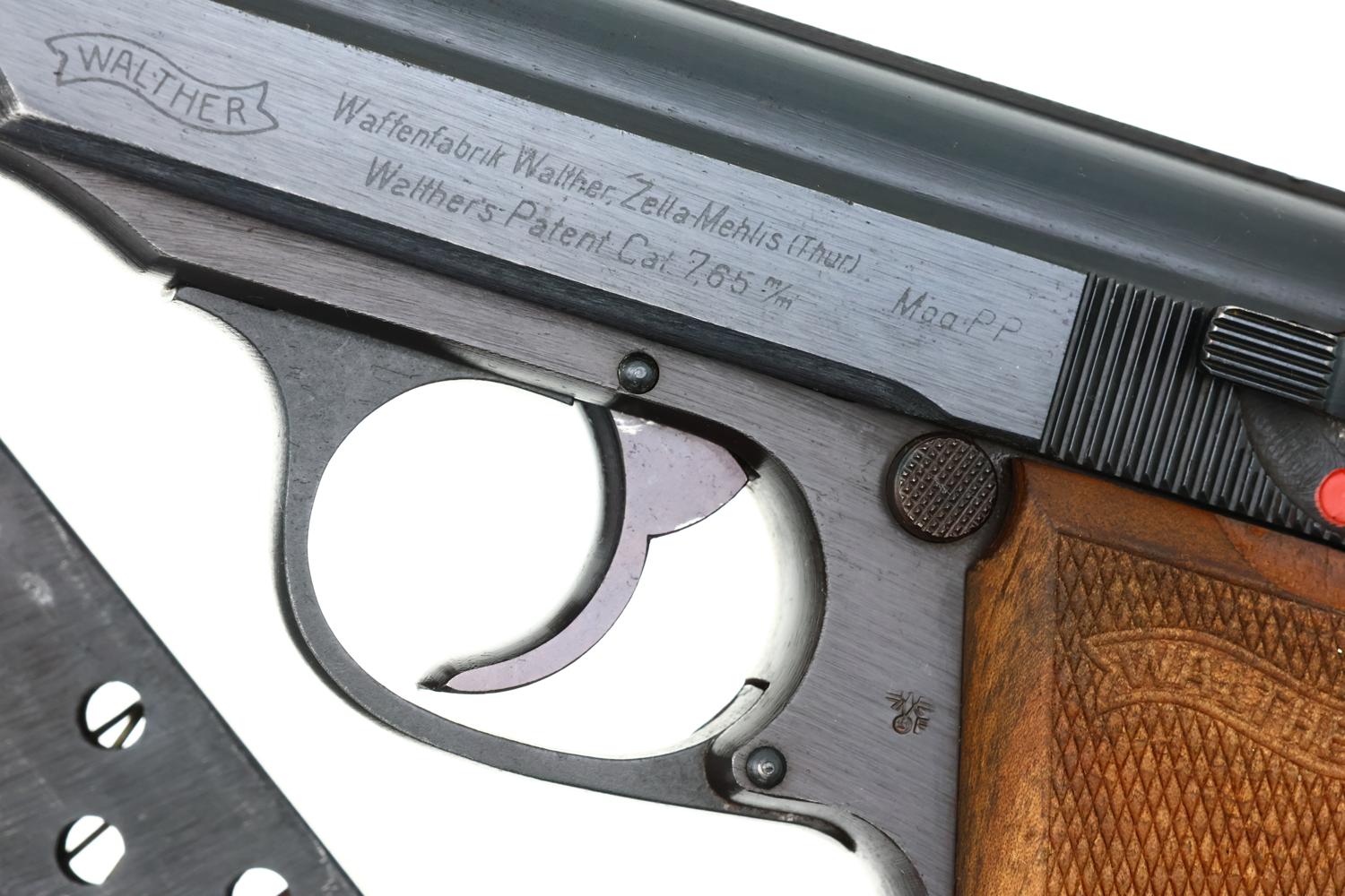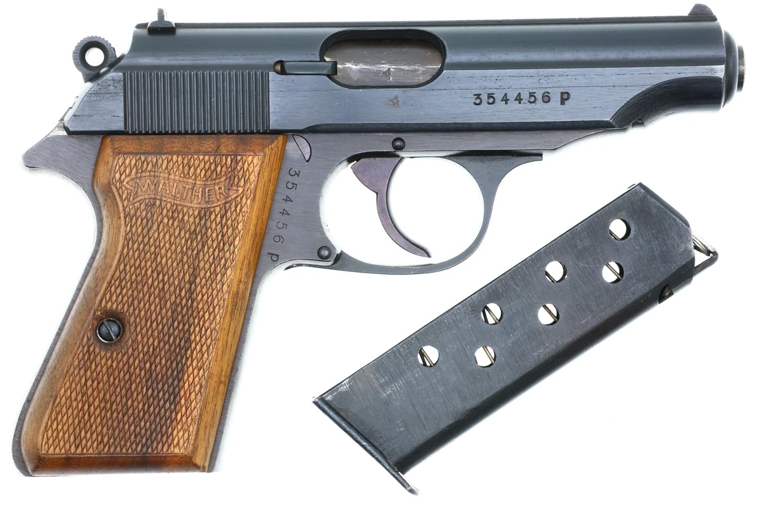 Scarce Walther PP pistol, late war milled finish, no loaded indicator, Eagle/F Police with Eagle/N proofing, beech grips, and correct milled finish magazine with seven indicator holes, the Walther Banner / PP 7.65mm on left side and a detachable floorplate.