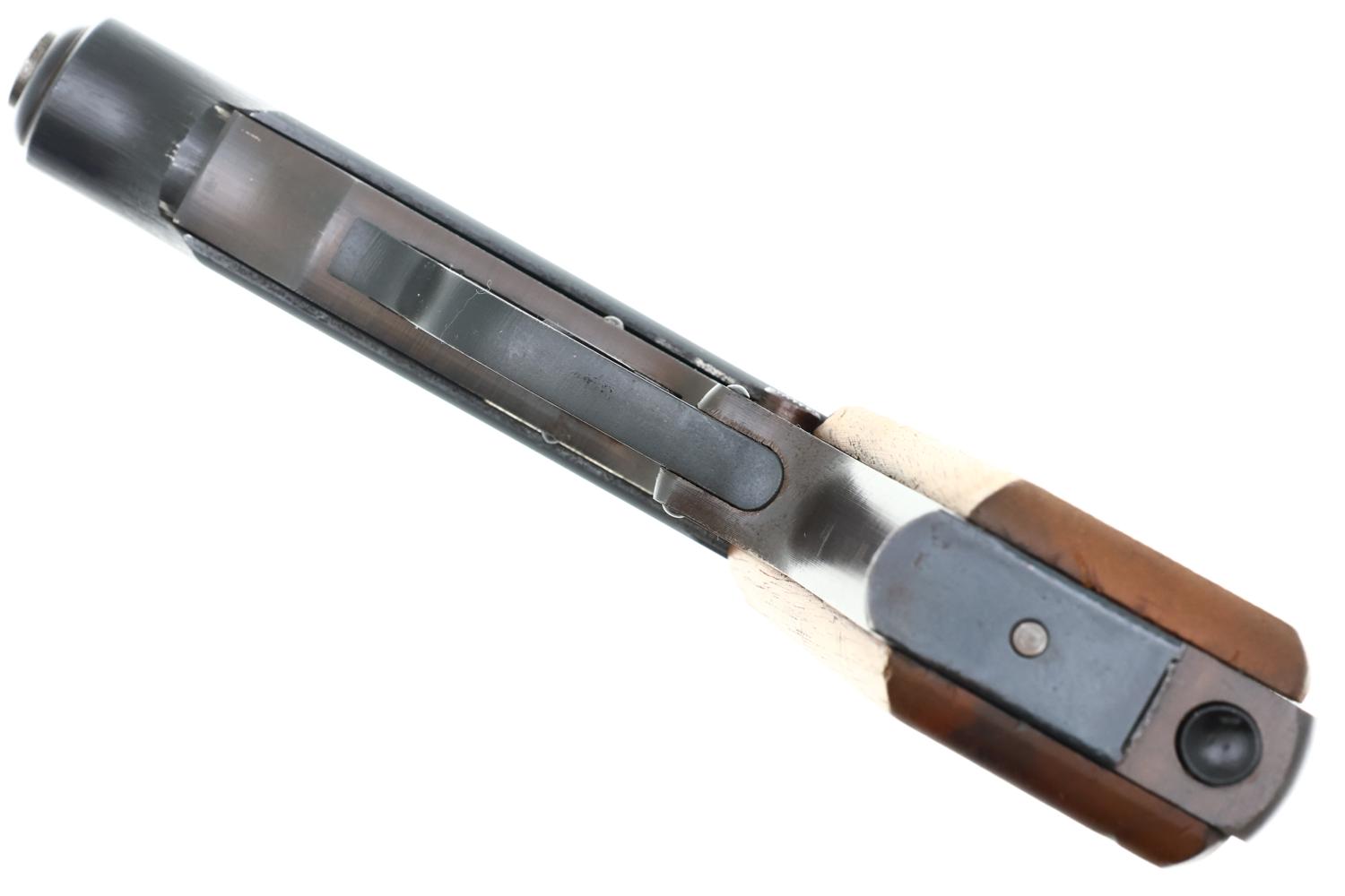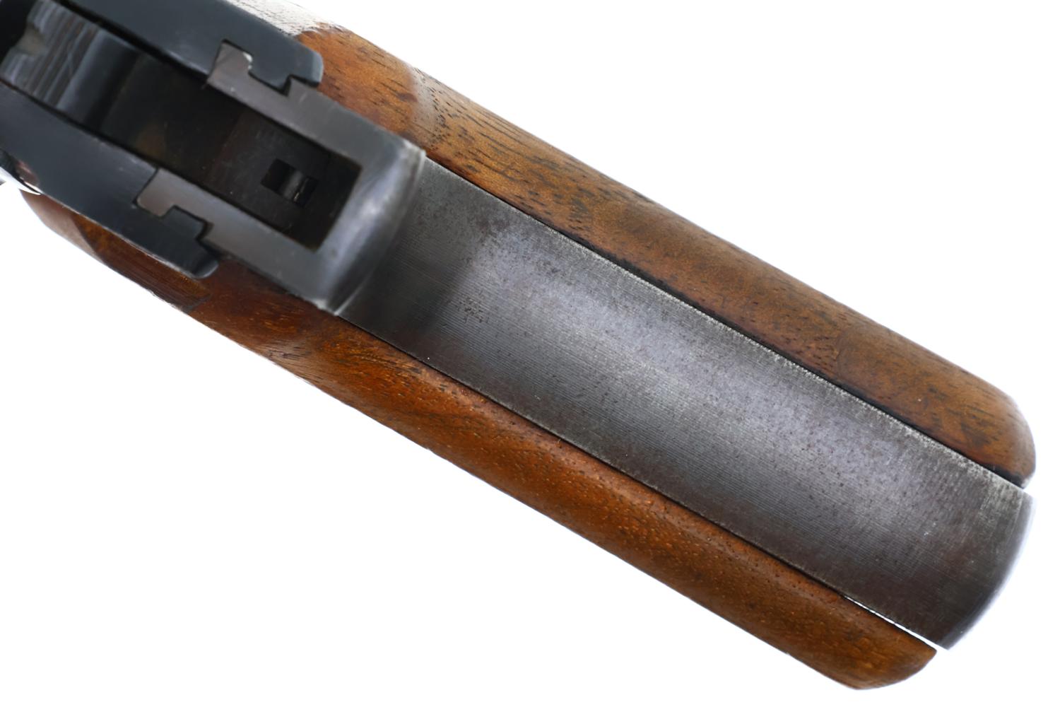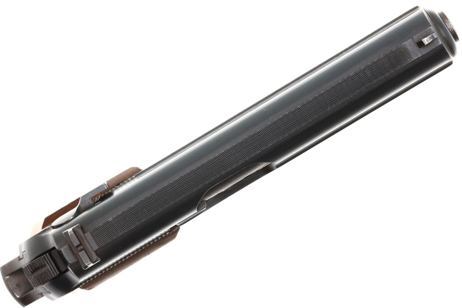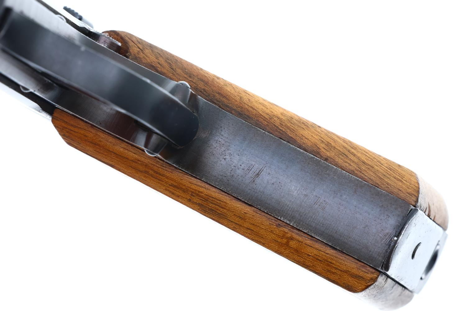 Crisp 98+% original finish with minimal muzzle wear and thinning of the backstrap in usual areas of holster/holster flap contact. Correct haloing/cratering of the later applied Eagle N and Eagle F proofs that break the finish. Beech grips with oil darkening and minimal pressed checkering blunting. Milled finish magazine in comparable condition. Mirror bore. Correct manual mechanics.