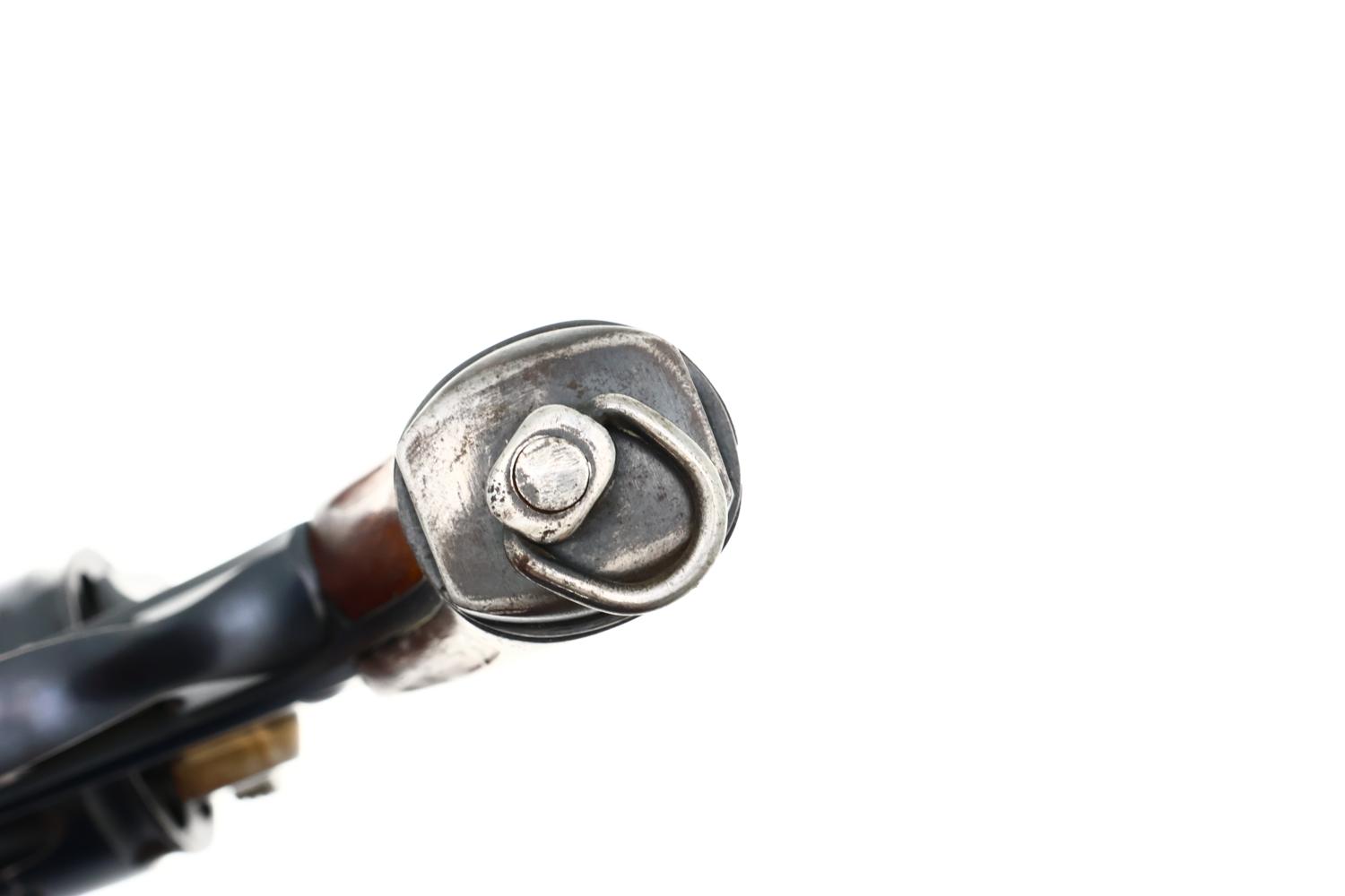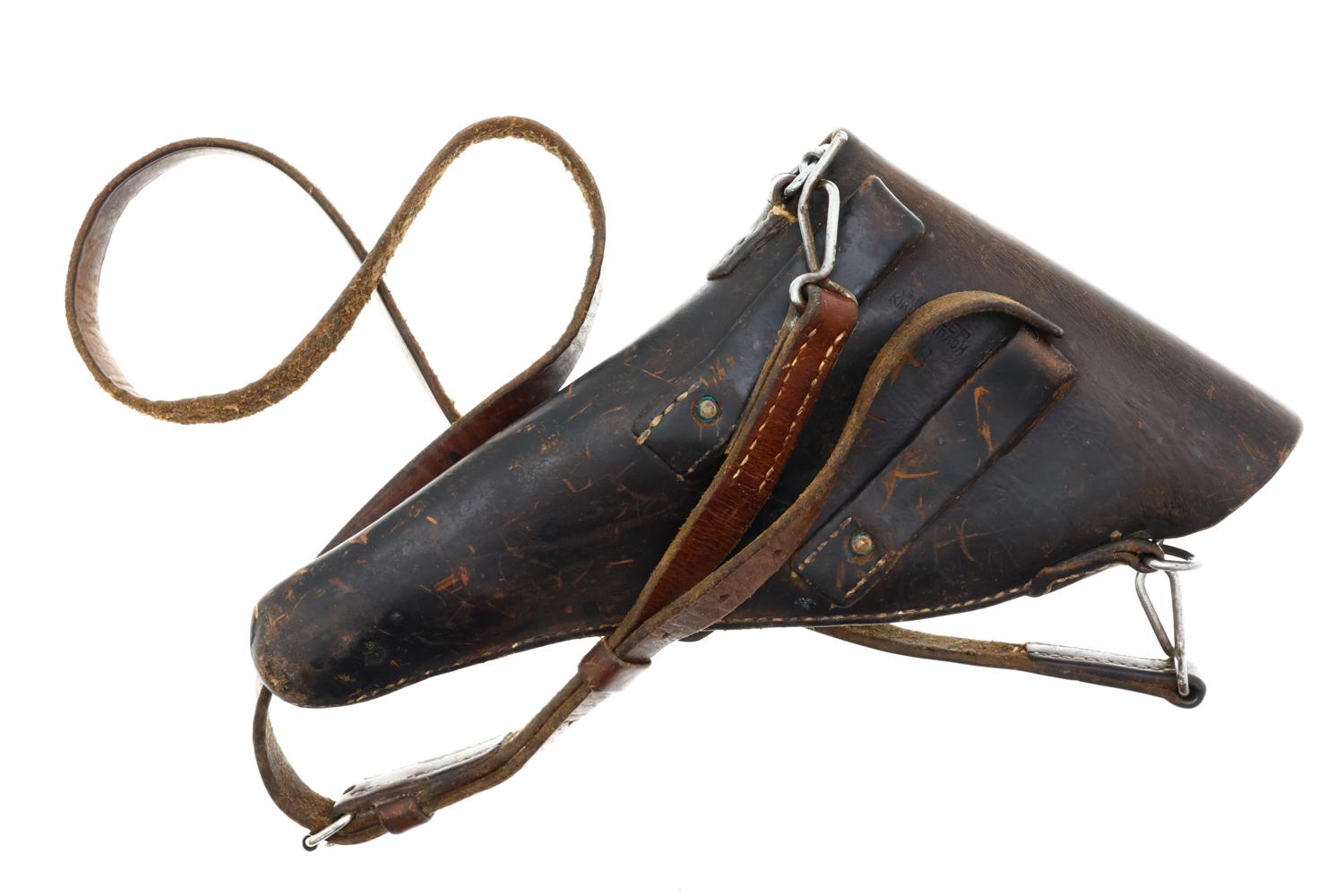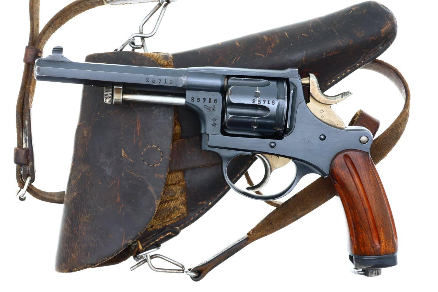 Excellent original rust blue retaining at least 97% coverage with minimal sharp edge wear, most thinning at butt of pistol around and involving lanyard ring. Comparable condition straw with no suggestion of enhancement. Crisp grips with few superficial handling marks, retaining most original varnish. Mirror bright bore. Correct manual mechanics. Good holster with oil darkening and numerous scuffs, original stitching intact. A very attractive and high condition Swiss military 1882 military revolver with a mirror-bright bore, tight lock up, and a correct holster with strap.