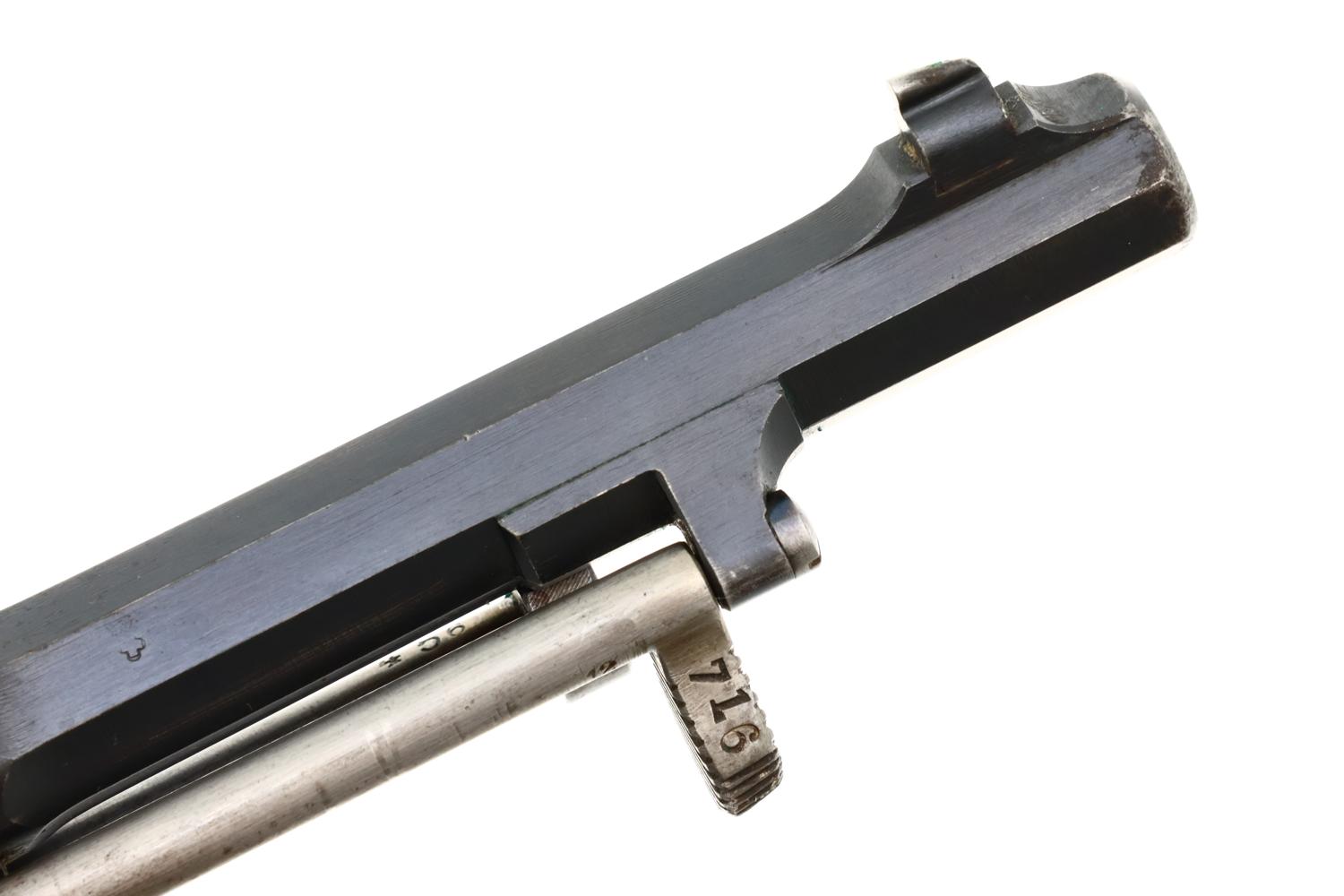 Standard mid-production Waffenfabrik Bern Model 1882 Revolver, deaccessioned P6x, chambered in 7.5mm, having a 6″ octagonal barrel with fixed front and notched rear sight. Waffenfabrik Bern logo on left side of frame under the full serial number 25716, the serial number or last few digits repeated on left side of barrel, cylinder, cylinder axle, ejector rod, hammer, loading gate, and trigger. Separate assembly numbers on various parts most notably ‘456’. Smooth wood fluted grips. Single transverse screw. Lanyard ring present. Complete with correct leather holster dated “18” with unmarked shoulder strap.