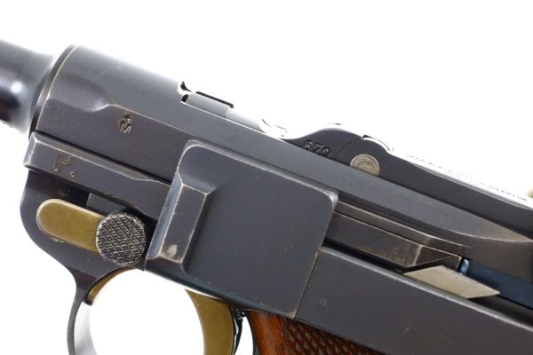 Standard configuration Bern 1924 Luger with 4.75” barrel having drift adjustable front sight and fixed “V” notch rear sight. Blank chamber. Middle link with WAFFENFABRIK BERN. Inspection marking on left side of receiver. “P” release on left rail, no date noted. Full serial number under barrel and forward frame with the last two-three digits under the sideplate, barrel extension, on all three components of the toggle, trigger, and each of the grips. Scattered Swiss crosses in usual locations. Major components are rust blued with strawed take down lever, trigger, magazine release and ejector. Orginal checkered grips with prominent border. Correct unnumbered magazine with wood plug. Holster dated “1950.” No strap.