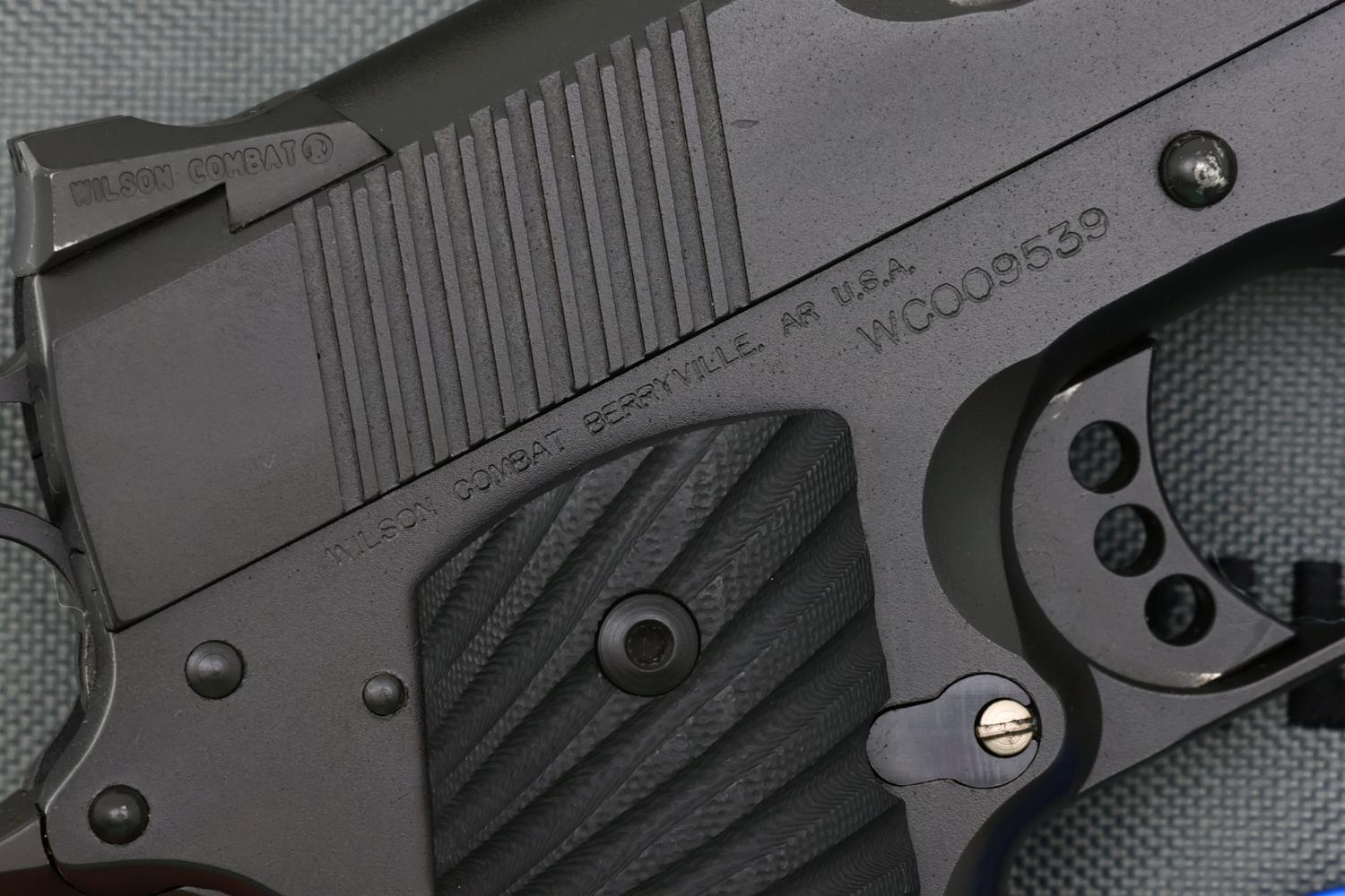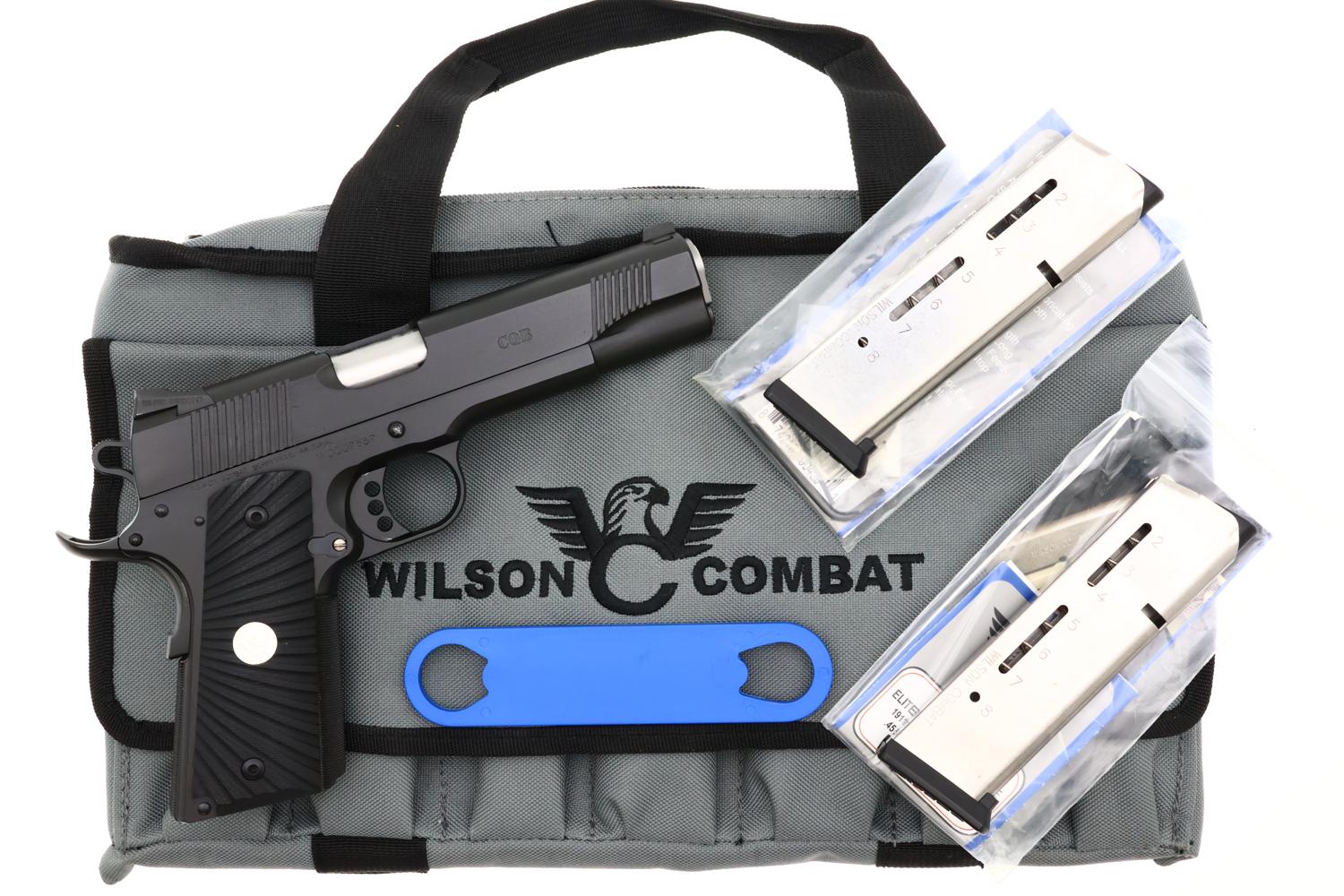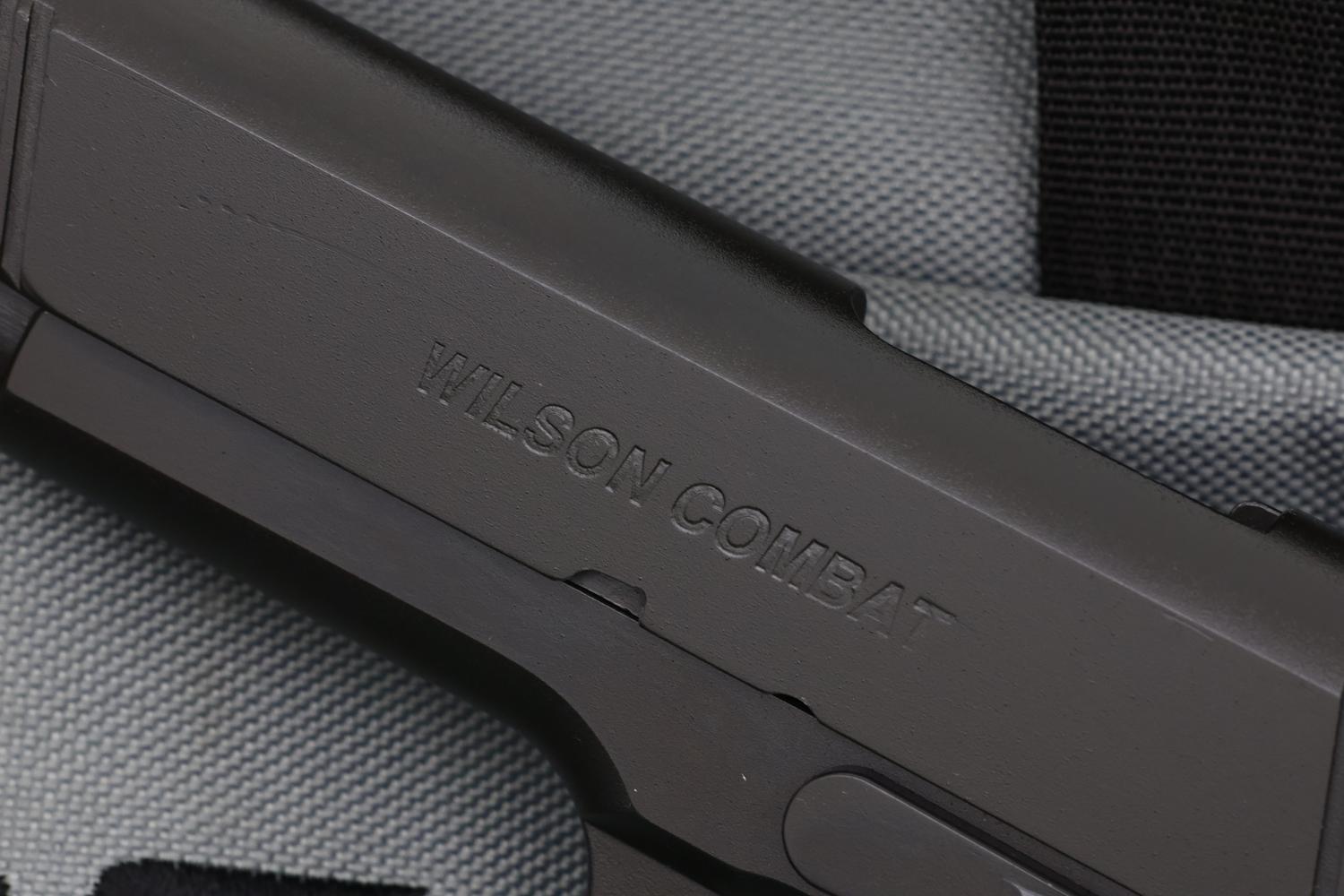 Near new with superficial scratch on left side of slide that does not break the finish, faint marks where trigger contacts frame, and a wear spot behind the hammer where it would contact the extended tang on recoil. No sharp edge wear, no thinning of straps, no wear on grips. Magazines appear as new. Mirror bore. Correct manual mechanics. Excellent blue plastic disassembly tool. Comparable condition gray Wilson Combat tactical carrying case. A great Wilson CQB pistol in .45 ACP that should please the pickiest buyer!