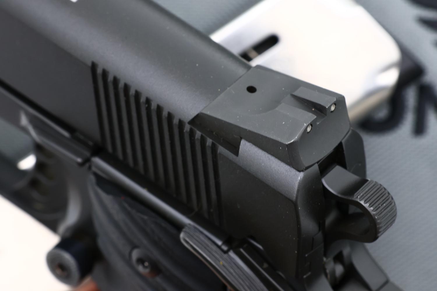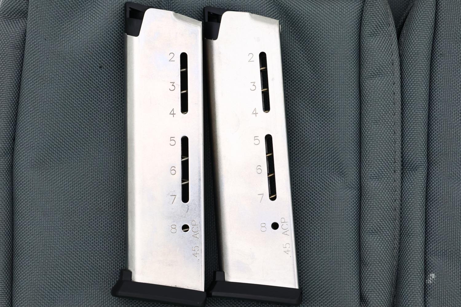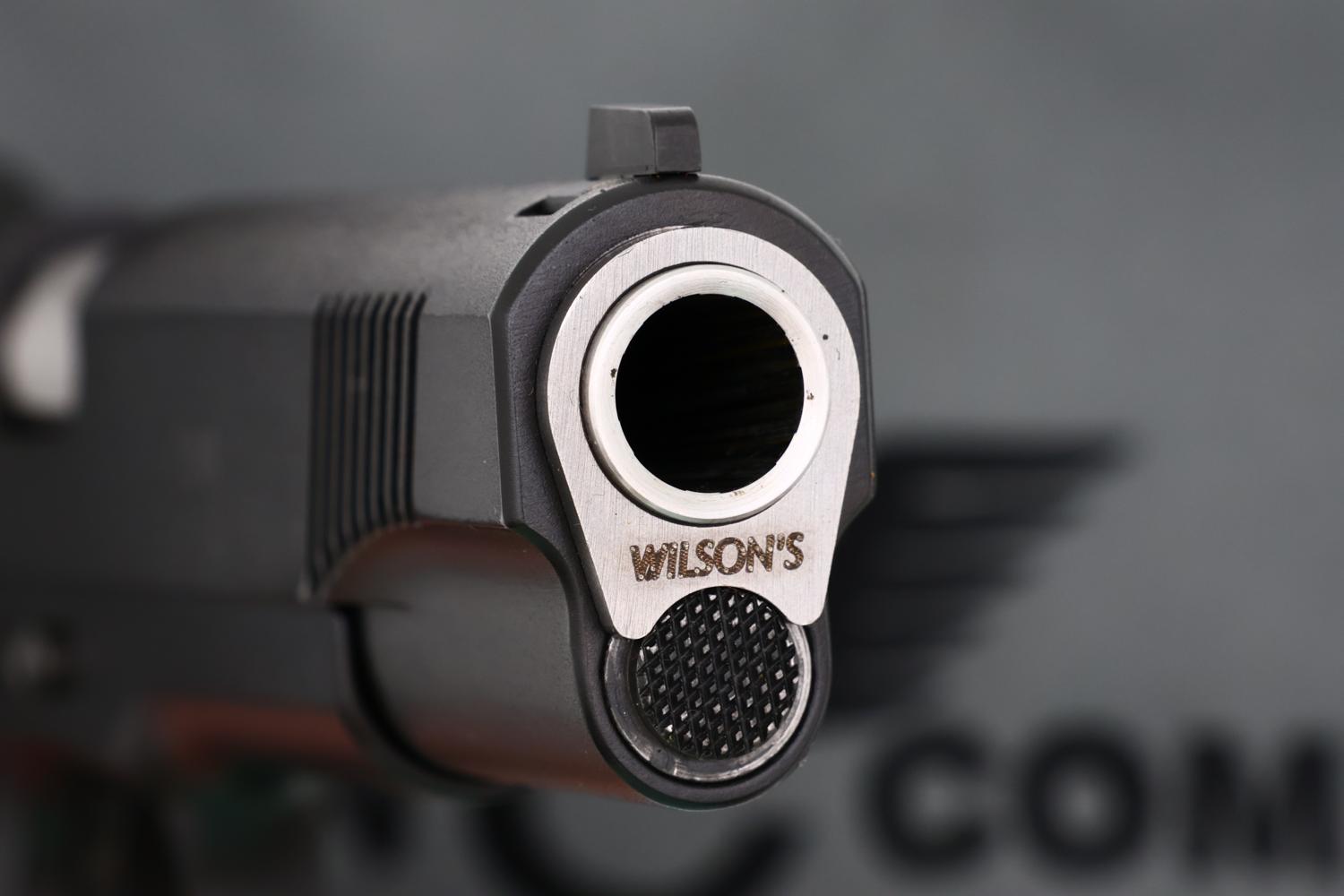 Near new with superficial scratch on left side of slide that does not break the finish, faint marks where trigger contacts frame, and a wear spot behind the hammer where it would contact the extended tang on recoil. No sharp edge wear, no thinning of straps, no wear on grips. Magazines appear as new. Mirror bore. Correct manual mechanics. Excellent blue plastic disassembly tool. Comparable condition gray Wilson Combat tactical carrying case. A great Wilson CQB pistol in .45 ACP that should please the pickiest buyer!