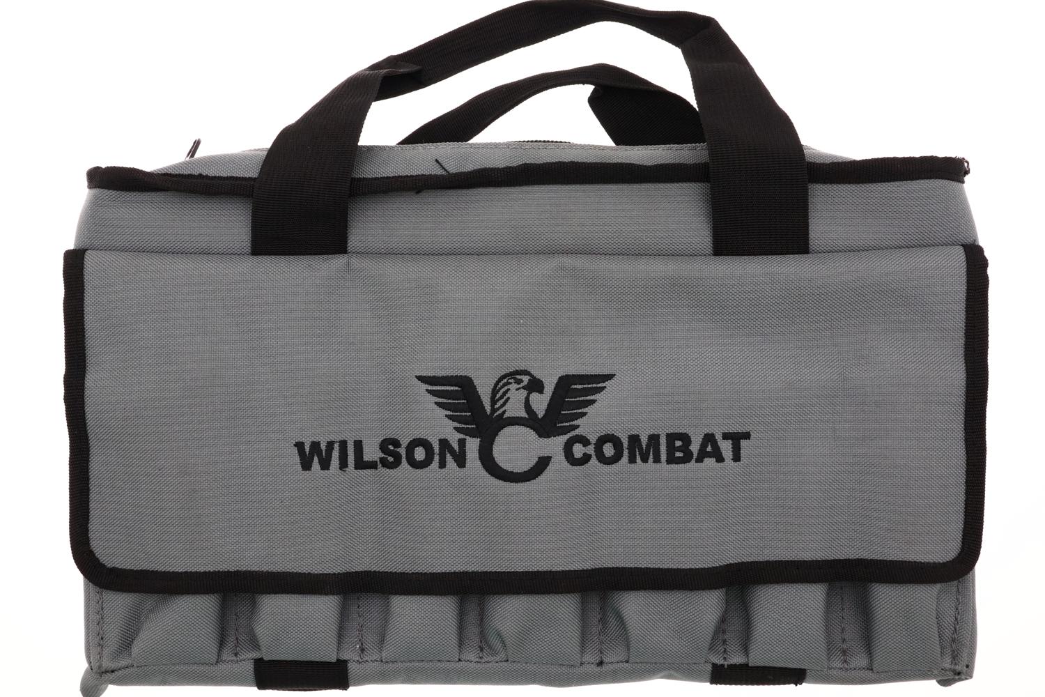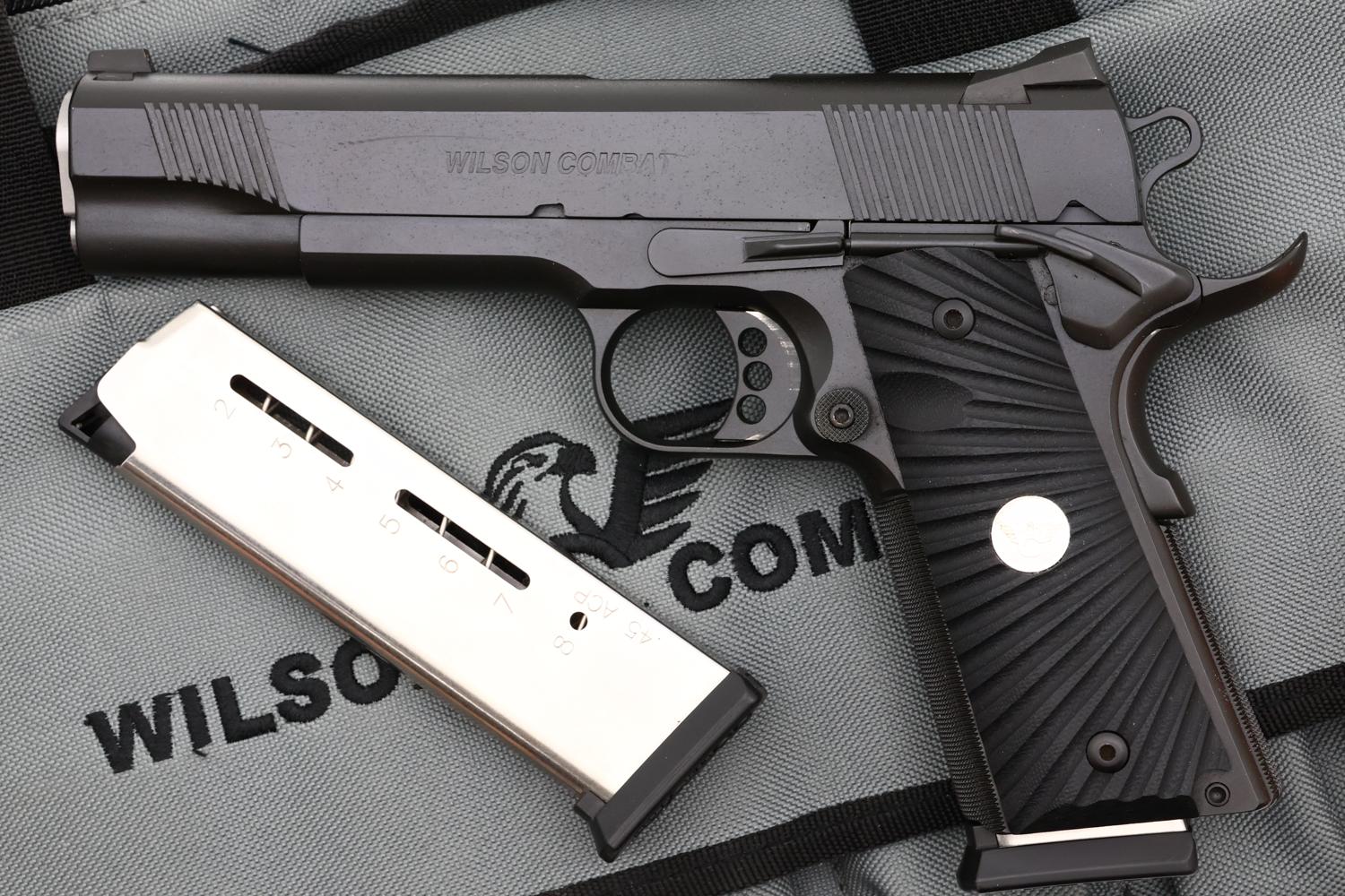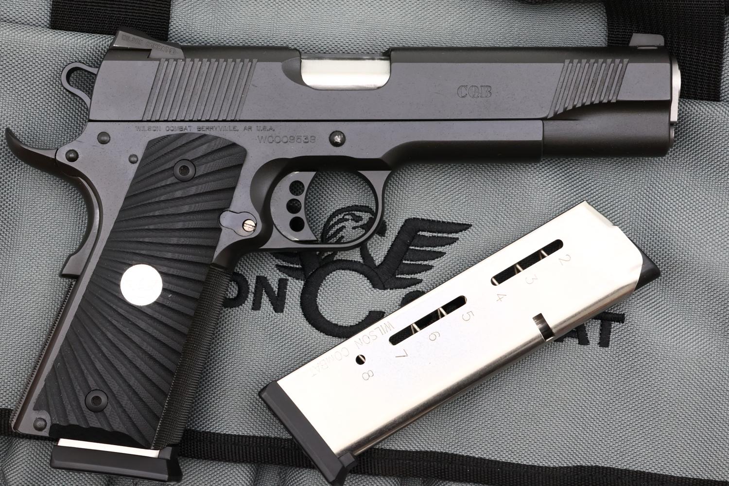 Wilson Combat CQB (Close Quarters Battle) Full-Size pistol in .45 ACP with 5″ barrel, serial number WC009539, representing the standard-bearer and most popular model in Wilson Combat’s CQB family of tactical 1911 platforms. Equipped with tactical tritium night sights in three-dot configuration with white outline rear sight and single white dot front sight. Left side of slide marked “WILSON COMBAT”, while right side of slide displays “CQB” and right side of frame shows Wilson Combat address and full serial number “WC009539.” Barrel hood marked “WILSON .45 ACP”. Barrel bushing marked “WILSON’S” at muzzle. Fitted with black textured synthetic grips featuring diagonal serrations and Wilson Combat logo medallions. Includes 2- 8 round Wilson Combat magazines with 2 elongated indicator holes and removable floorplate marked ‘WILSON COMBAT”. Complete with gray Wilson Combat tactical carrying case featuring company logo and eagle emblem, dual carry handles, zippered closure, and internal organization pockets for magazines and accessory tool. Wilson Combat, established as “Wilson’s Gun Shop” in 1977 by Bill Wilson and based in Berryville, Arkansas, specializes in custom M1911A1 manufacturing and customization, with their handguns utilized by special forces including Delta Force and Navy SEALs.
