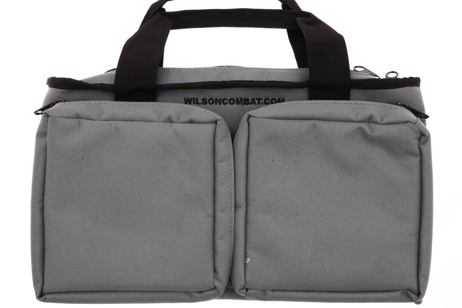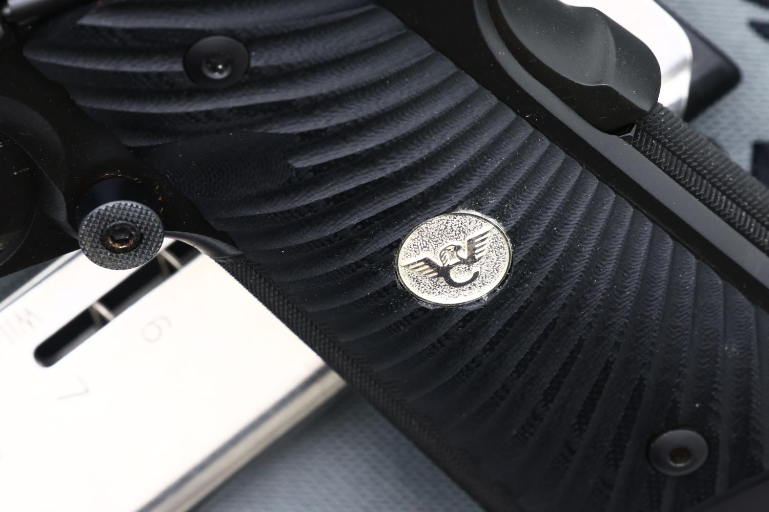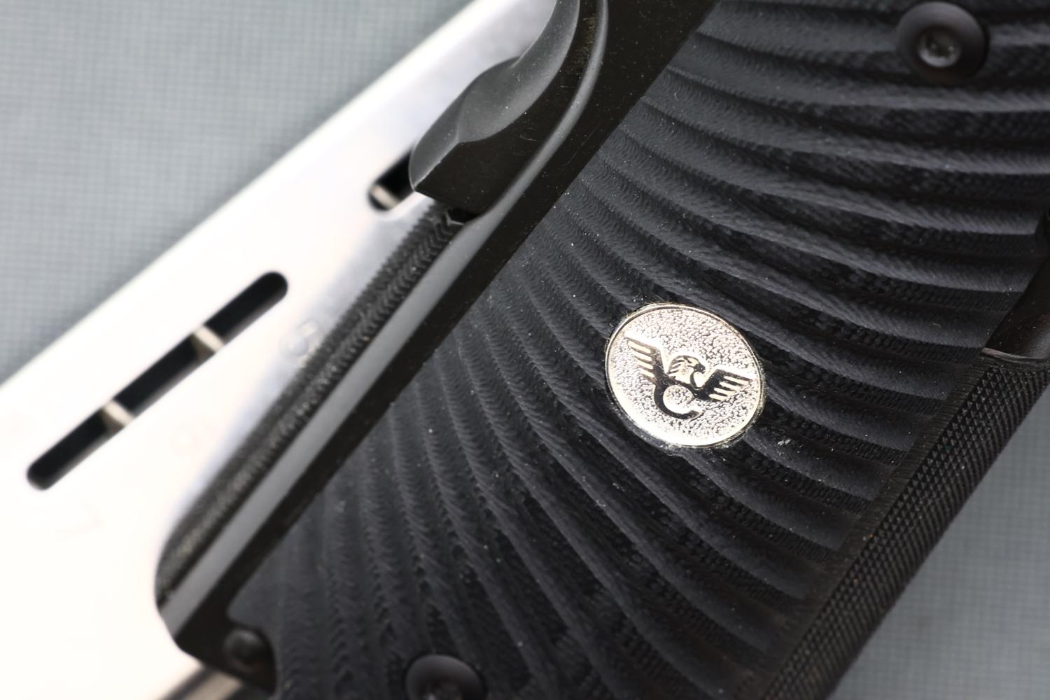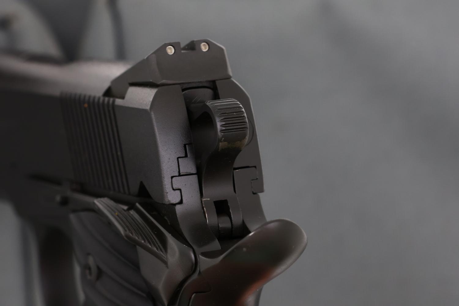 Wilson Combat CQB (Close Quarters Battle) Full-Size pistol in .45 ACP with 5″ barrel, serial number WC009539, representing the standard-bearer and most popular model in Wilson Combat’s CQB family of tactical 1911 platforms. Equipped with tactical tritium night sights in three-dot configuration with white outline rear sight and single white dot front sight. Left side of slide marked “WILSON COMBAT”, while right side of slide displays “CQB” and right side of frame shows Wilson Combat address and full serial number “WC009539.” Barrel hood marked “WILSON .45 ACP”. Barrel bushing marked “WILSON’S” at muzzle. Fitted with black textured synthetic grips featuring diagonal serrations and Wilson Combat logo medallions. Includes 2- 8 round Wilson Combat magazines with 2 elongated indicator holes and removable floorplate marked ‘WILSON COMBAT”. Complete with gray Wilson Combat tactical carrying case featuring company logo and eagle emblem, dual carry handles, zippered closure, and internal organization pockets for magazines and accessory tool. Wilson Combat, established as “Wilson’s Gun Shop” in 1977 by Bill Wilson and based in Berryville, Arkansas, specializes in custom M1911A1 manufacturing and customization, with their handguns utilized by special forces including Delta Force and Navy SEALs.